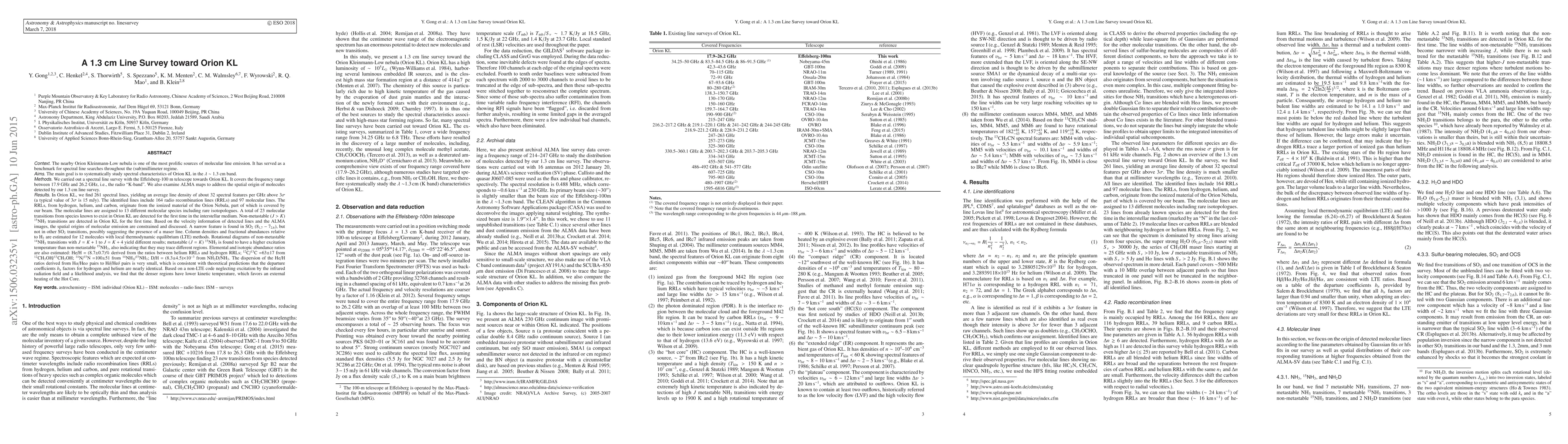 This study conducted a spectral line survey of Orion KL in the 1.3 cm band using the Effelsberg-100 m telescope, identifying 261 spectral lines, including 23 first-time detections of molecular transitions. The research reveals distinct elemental and isotopic abundance ratios and suggests external heating for the Hot Core region based on kinetic temperature analysis.