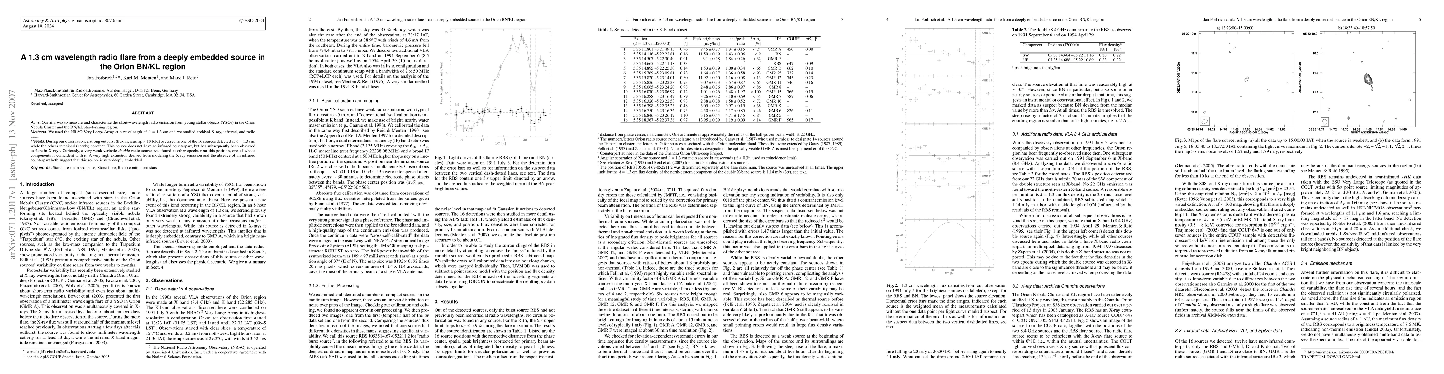 Aims: Our aim was to measure and characterize the short-wavelength radio emission from young stellar objects (YSOs) in the Orion Nebula Cluster and the BN/KL star-forming region. Methods: We used the NRAO Very Large Array at a wavelength of 1.3 cm and we studied archival X-ray, infrared, and radio data. Results: During our observation, a strong outburst (flux increasing >10 fold) occurred in one of the 16 sources detected at a wavelength of 1.3cm, while the others remained (nearly) constant. This source does not have an infrared counterpart, but has subsequently been observed to flare in X-rays. Curiously, a very weak variable double radio source was found at other epochs near this position, one of whose components is coincident with it. A very high extinction derived from modeling the X-ray emission and the absence of an infrared counterpart both suggest that this source is very deeply embedded.
