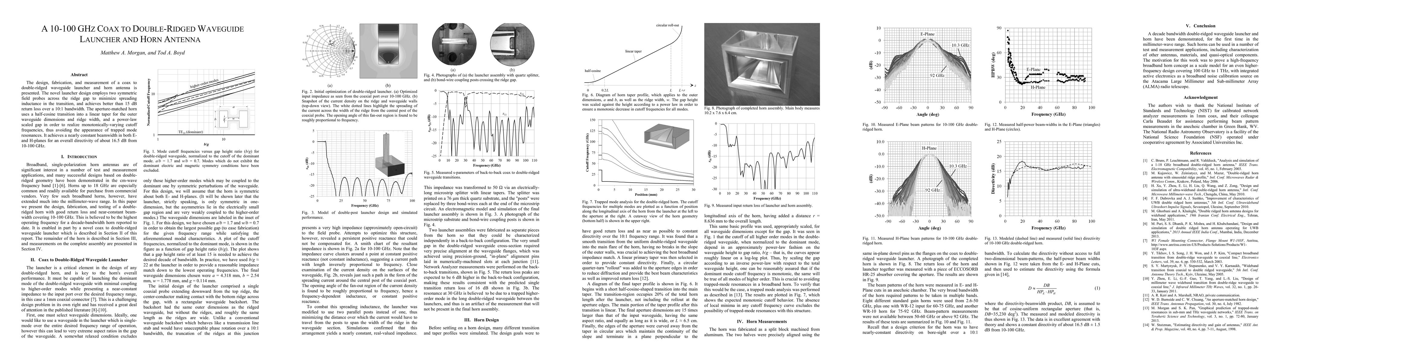This paper details the design and evaluation of a novel coaxial to double-ridged waveguide launcher and horn antenna, achieving over 15 dB return loss across a 10:1 bandwidth. The design minimizes inductance and avoids trapped mode resonances, resulting in a nearly constant beamwidth and 16.5 dB directivity from 10-100 GHz.
