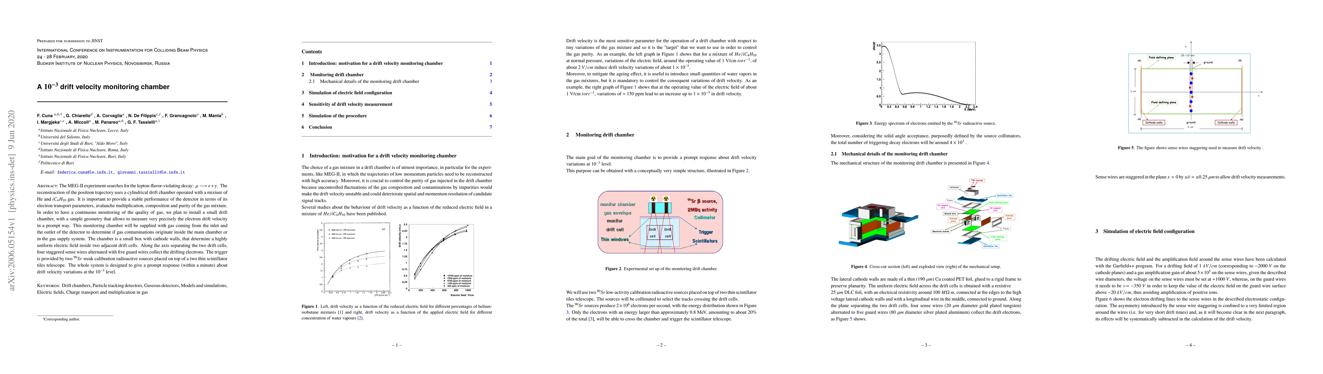 The MEG-II experiment employs a 10-3 drift velocity monitoring chamber to ensure stable electron transport parameters in a He and iC4H10 gas mixture, using precise measurements to detect gas contaminations and maintain detector performance. The chamber features a simple geometry with staggered sense and guard wires, and a prompt response system to monitor drift velocity variations at the 0.001 level.