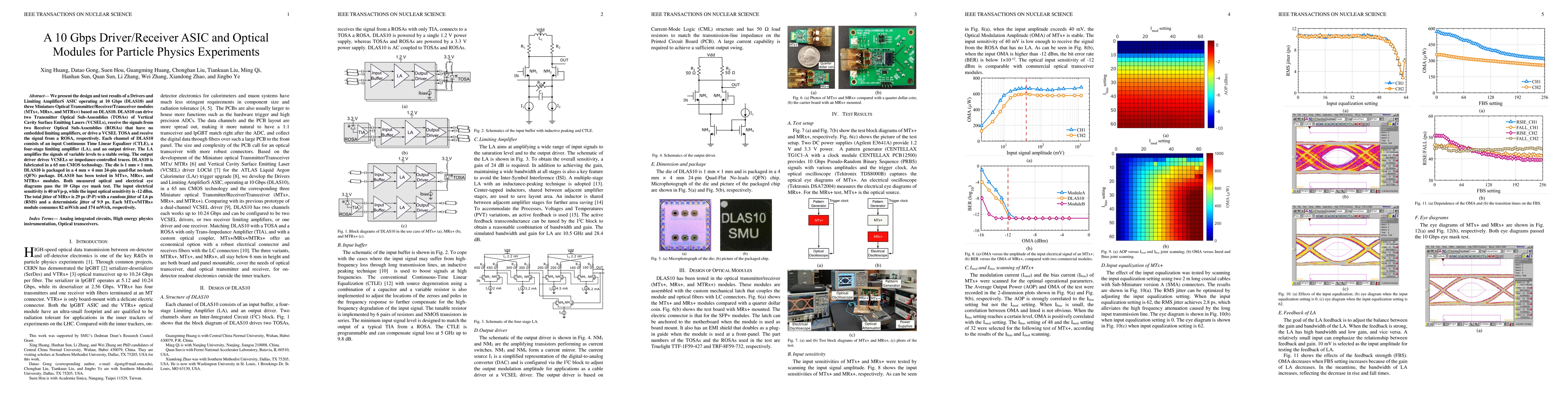 This paper details a 10 Gbps Driver/Receiver ASIC (DLAS10) and associated optical modules for particle physics experiments, demonstrating successful operation and performance metrics including input sensitivity and jitter. The DLAS10 ASIC is fabricated in 65 nm CMOS technology and integrates a limiting amplifier and output driver.