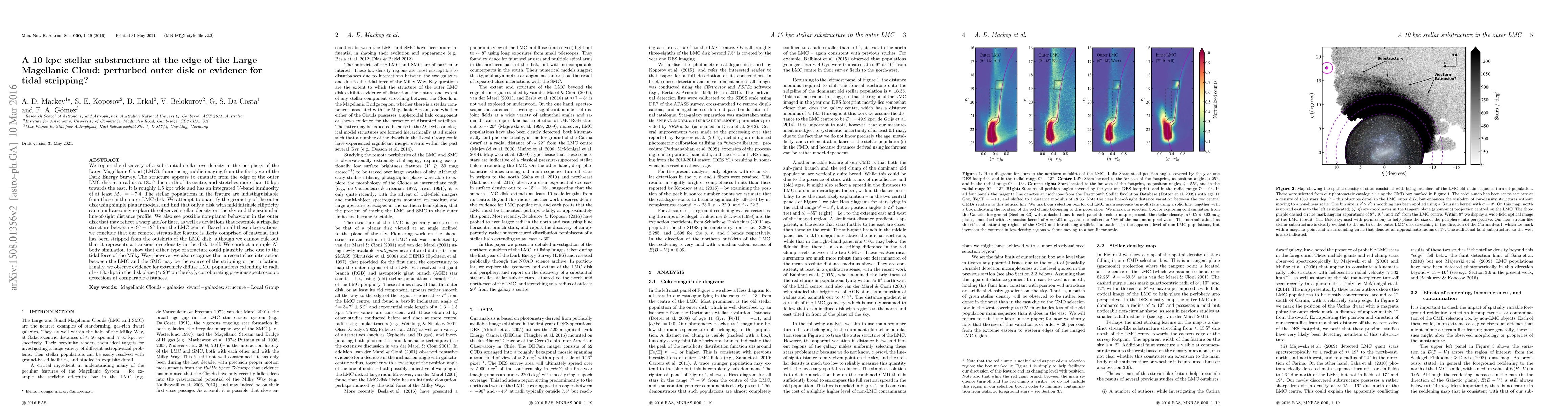 This paper reports the discovery of a 10 kpc stellar overdensity in the periphery of the Large Magellanic Cloud (LMC), likely resulting from tidal stripping or disk perturbation, possibly due to interactions with the Milky Way or the Small Magellanic Cloud. The structure's similarity to the outer LMC disk and non-planar behavior suggest complex dynamics.