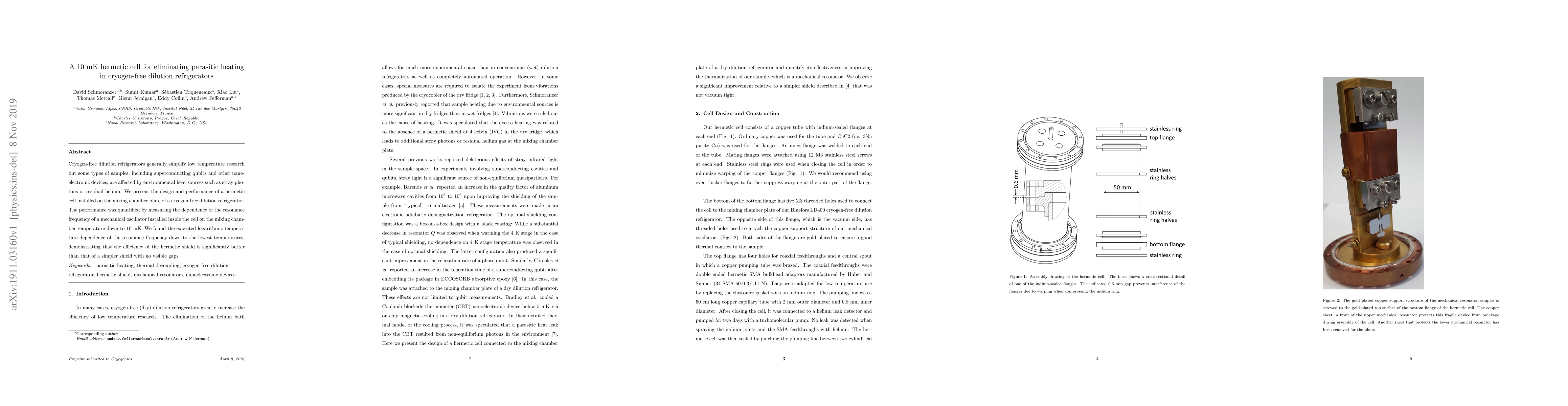 This paper details the design and performance of a hermetic cell for a cryogen-free dilution refrigerator, which effectively eliminates parasitic heating. The cell's efficiency was demonstrated by measuring the temperature dependence of a mechanical oscillator's resonance frequency down to 10 mK, showing superior performance over simpler shielding methods.