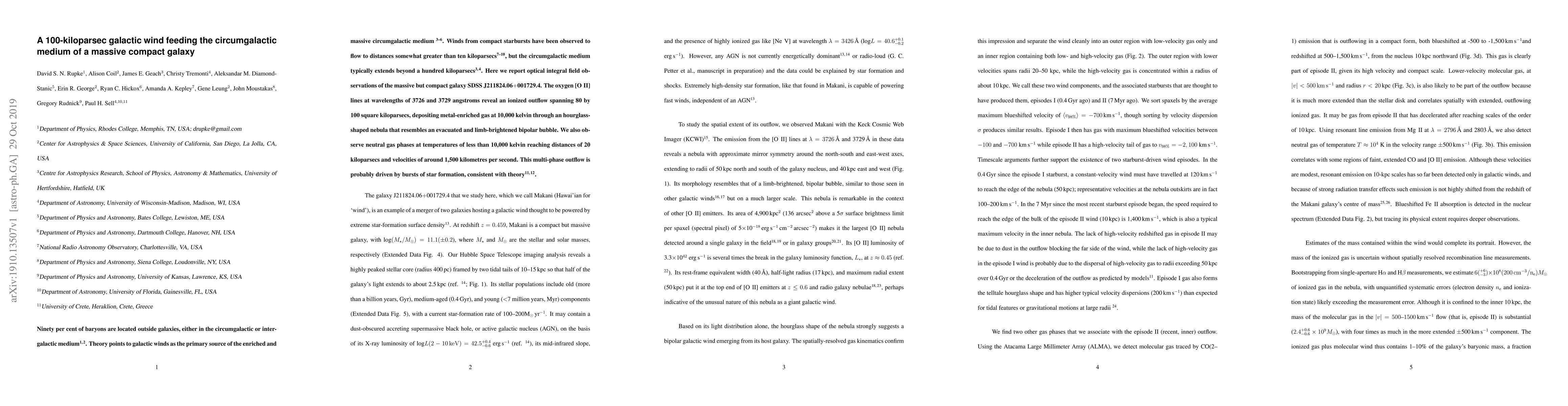 Ninety per cent of baryons are located outside galaxies, either in the circumgalactic or intergalactic medium. Theory points to galactic winds as the primary source of the enriched and massive circumgalactic medium. Winds from compact starbursts have been observed to flow to distances somewhat greater than ten kiloparsecs, but the circumgalactic medium typically extends beyond a hundred kiloparsecs. Here we report optical integral field observations of the massive but compact galaxy SDSS J211824.06+001729.4. The oxygen [O II] lines at wavelengths of 3726 and 3729 angstroms reveal an ionized outflow spanning 80 by 100 square kiloparsecs, depositing metal-enriched gas at 10,000 kelvin through an hourglass-shaped nebula that resembles an evacuated and limb-brightened bipolar bubble. We also observe neutral gas phases at temperatures of less than 10,000 kelvin reaching distances of 20 kiloparsecs and velocities of around 1,500 kilometres per second. This multi-phase outflow is probably driven by bursts of star formation, consistent with theory.