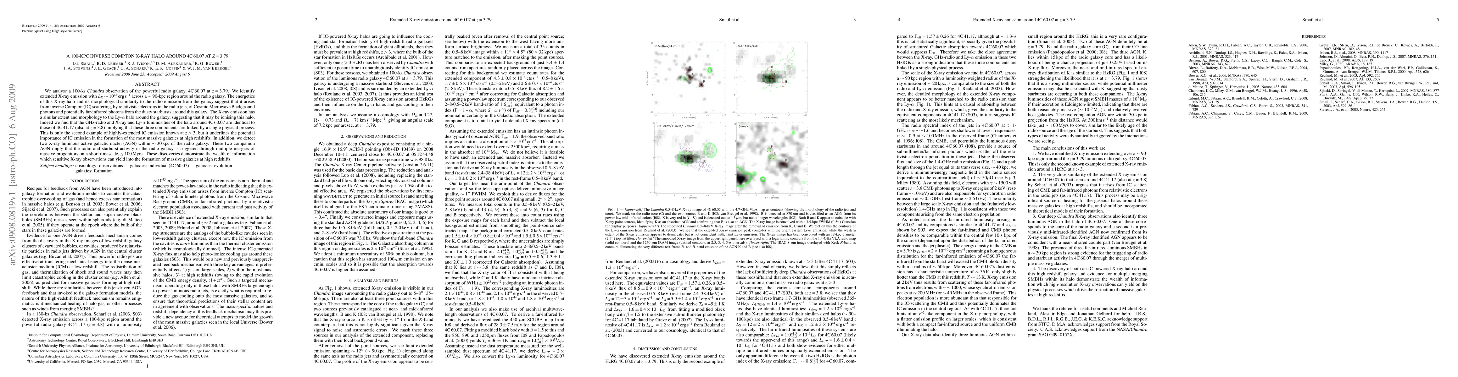This paper analyzes a Chandra observation of the radio galaxy 4C60.07 at z=3.79, revealing a 100-kpc inverse Compton X-ray halo likely formed by relativistic electrons scattering Cosmic Microwave Background photons. The X-ray halo's similarity to the Ly-alpha halo suggests it ionizes it, linking the radio, X-ray, and Ly-alpha emissions through a common physical process.
