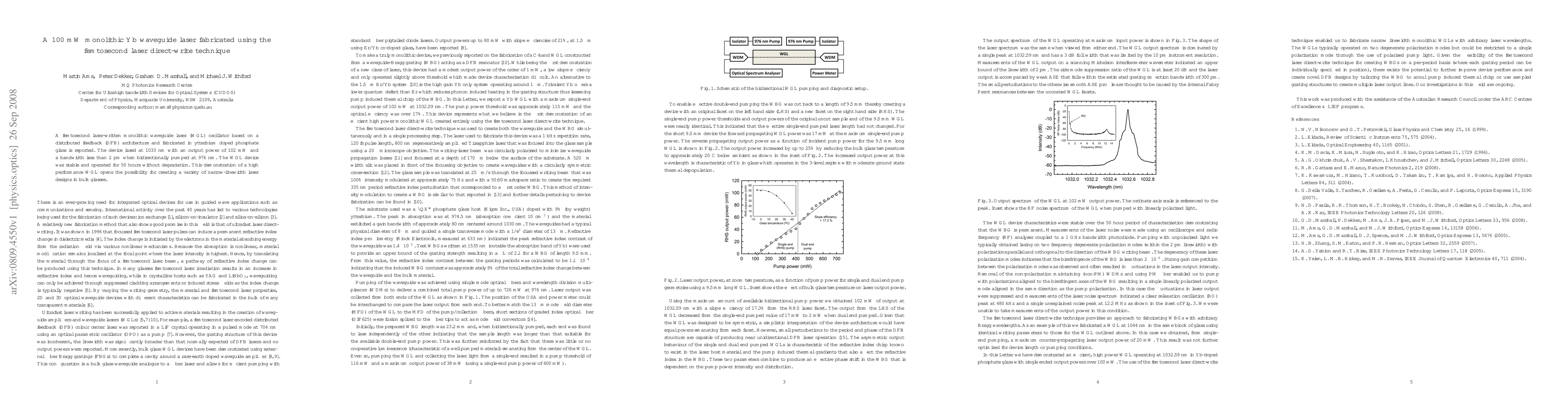 A femtosecond laser-written monolithic waveguide laser based on a DFB architecture in ytterbium-doped phosphate glass emits at 1033 nm with an output power of 102 mW and a bandwidth under 2 pm, demonstrating stability for 50 hours. This high-performance laser indicates potential for diverse narrow-linewidth designs in bulk glasses.