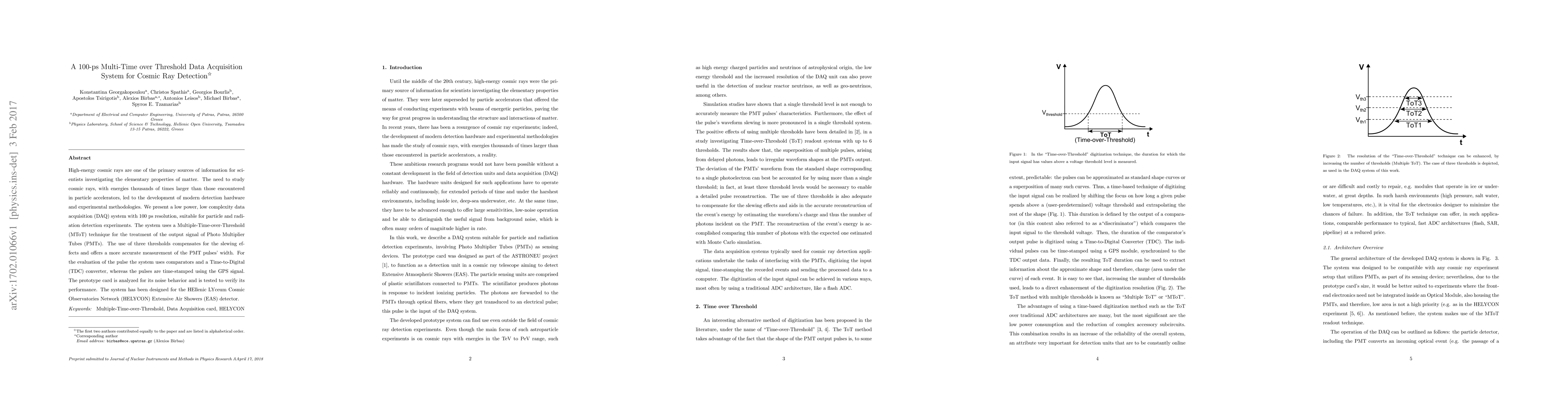 High-energy cosmic rays are one of the primary sources of information for scientists investigating the elementary properties of matter. The need to study cosmic rays, with energies thousands of times larger than those encountered in particle accelerators, led to the development of modern detection hardware and experimental methodologies. We present a low power, low complexity data acquisition (DAQ) system with 100 ps resolution, suitable for particle and radiation detection experiments. The system uses a Multiple-Time-over-Threshold (MToT) technique for the treatment of the output signal of Photo Multiplier Tubes (PMTs). The use of three thresholds compensates for the slewing effects and offers a more accurate measurement of the PMT pulses' width. For the evaluation of the pulse the system uses comparators and a Time-to-Digital (TDC) converter, whereas the pulses are time-stamped using the GPS signal. The prototype card is analyzed for its noise behavior and is tested to verify its performance. The system has been designed for the HEllenic LYceum Cosmic Observatories Network (HELYCON) Extensive Air Showers (EAS) detector.
