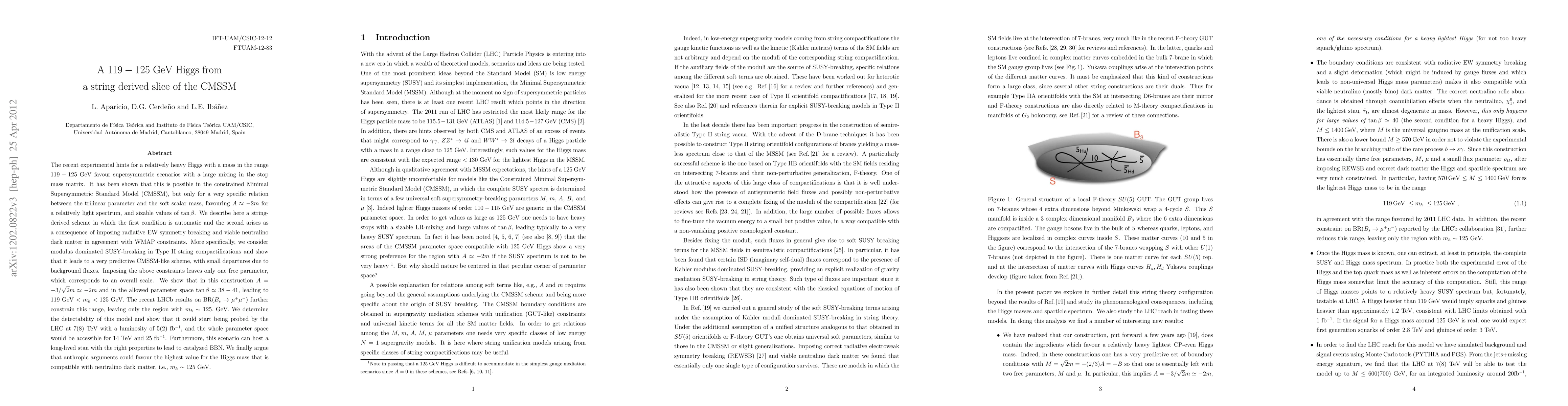 The recent experimental hints for a relatively heavy Higgs with a mass in the range 119-125 GeV favour supersymmetric scenarios with a large mixing in the stop mass matrix. It has been shown that this is possible in the constrained Minimal Supersymmetric Standard Model (CMSSM), but only for a very specific relation between the trilinear parameter and the soft scalar mass, favouring A ~ -2m for a relatively light spectrum, and sizable values of tan(beta). We describe here a string-derived scheme in which the first condition is automatic and the second arises as a consequence of imposing radiative EW symmetry breaking and viable neutralino dark matter in agreement with WMAP constraints. More specifically, we consider modulus dominated SUSY-breaking in Type II string compactifications and show that it leads to a very predictive CMSSM-like scheme, with small departures due to background fluxes. Imposing the above constraints leaves only one free parameter, which corresponds to an overall scale. We show that in this construction $A=-3\sqrt{2}m\approx -2m$ and in the allowed parameter space tan(beta)=38-41, leading to 119 GeV < m_h < 125 GeV. We determine the detectability of this model and show that it could start being probed by the LHC at 7(8) TeV with a luminosity of 5(2) fb^-1, and the whole parameter space would be accessible for 14 TeV and 25 fb^-1. Furthermore, this scenario can host a long-lived stau with the right properties to lead to catalyzed BBN. We finally argue that anthropic arguments could favour the highest value for the Higgs mass that is compatible with neutralino dark matter, i.e., m_h~125 GeV.