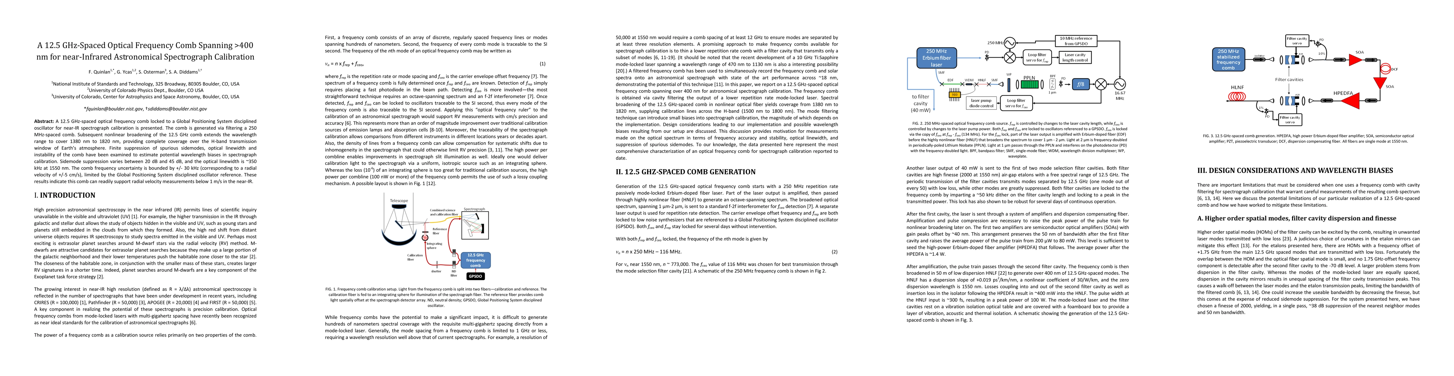 This paper presents a 12.5 GHz-spaced optical frequency comb for near-IR spectrograph calibration, spanning 1380 nm to 1820 nm. The comb's stability and sidemode suppression enable accurate radial velocity measurements below 1 m/s.