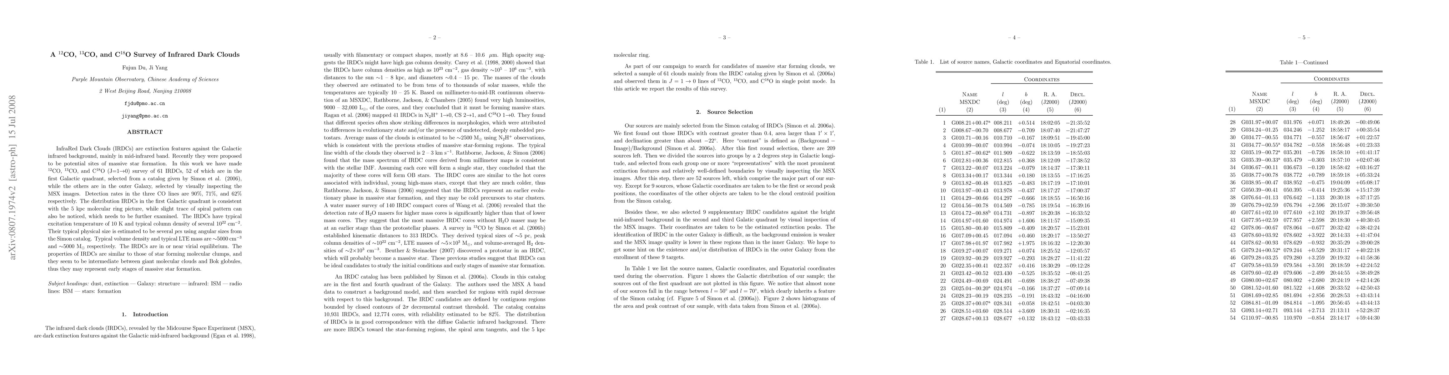 This study conducted a 12CO, 13CO, and C18O survey of 61 Infrared Dark Clouds (IRDCs), finding high detection rates and properties similar to star-forming regions, suggesting they may represent early stages of massive star formation. The IRDCs exhibit typical temperatures, densities, and masses indicative of virial equilibrium.