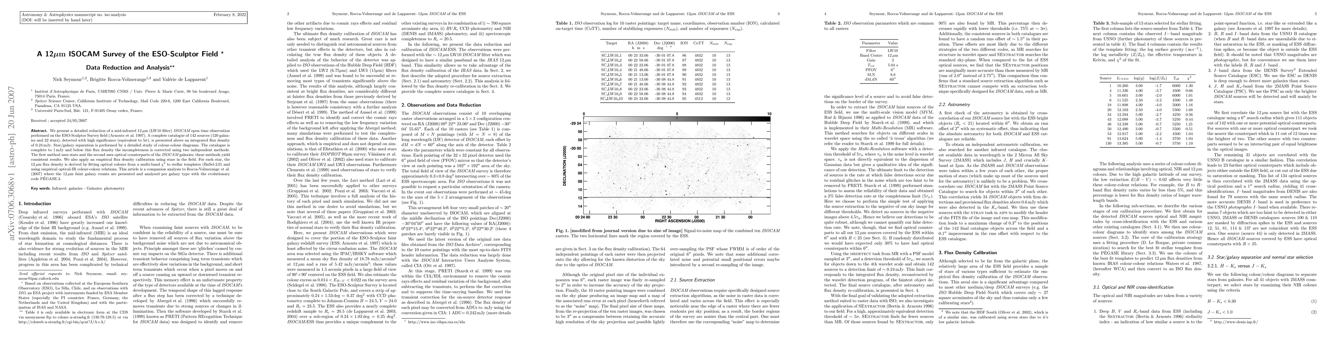 We present a detailed reduction of a mid-infrared 12um (LW10 filter) ISOCAM open time observation performed on the ESO-Sculptor Survey field (Arnouts et al. 1997). A complete catalogue of 142 sources (120 galaxies and 22 stars), detected with high significance (equivalent to 5sigma), is presented above an integrated flux density of 0.24mJy. Star/galaxy separation is performed by a detailed study of colour-colour diagrams. The catalogue is complete to 1mJy and below this flux density the incompleteness is corrected using two independent methods. The first method uses stars and the second uses optical counterparts of the ISOCAM galaxies; these methods yield consistent results. We also apply an empirical flux density calibration using stars in the field. For each star, the 12um flux density is derived by fitting optical colours from a multi-band chi^2 to stellar templates (BaSel-2.0) and using empirical optical-IR colour-colour relations. This article is a companion analysis to Rocca-Volmerange 2007 et al. where the 12um faint galaxy counts are presented and analysed by galaxy type with the evolutionary code PEGASE.3.