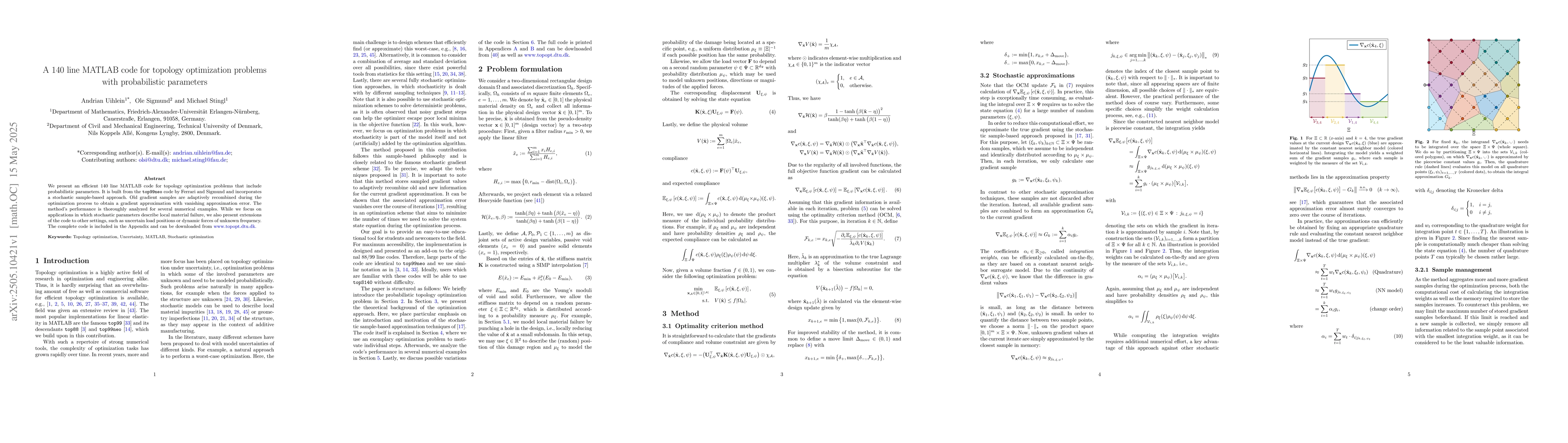 The research presents a 140-line MATLAB code for topology optimization problems incorporating probabilistic parameters, built upon the top99neo code by Ferrari and Sigmund. It uses a stochastic sample-based approach, adaptively recombining old gradient samples to achieve a gradient approximation with vanishing error.
