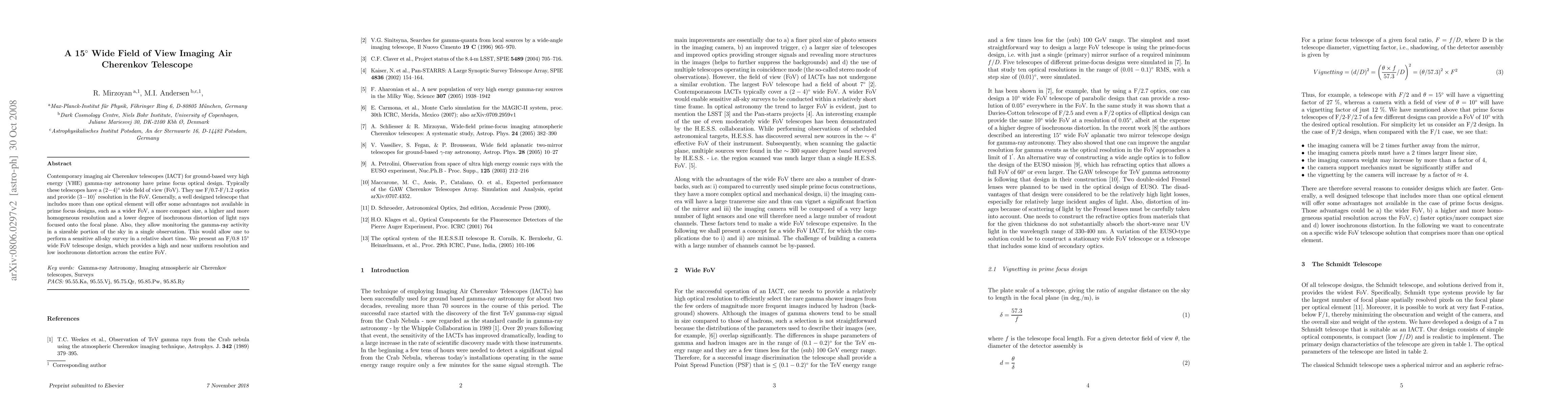 This paper presents a novel imaging air Cherenkov telescope design with a 15-degree wide field of view, offering a significant improvement over traditional 2-4 degree designs. The new design achieves a high and uniform resolution with low isochronous distortion, enabling more efficient all-sky surveys in very high energy gamma ray astronomy.