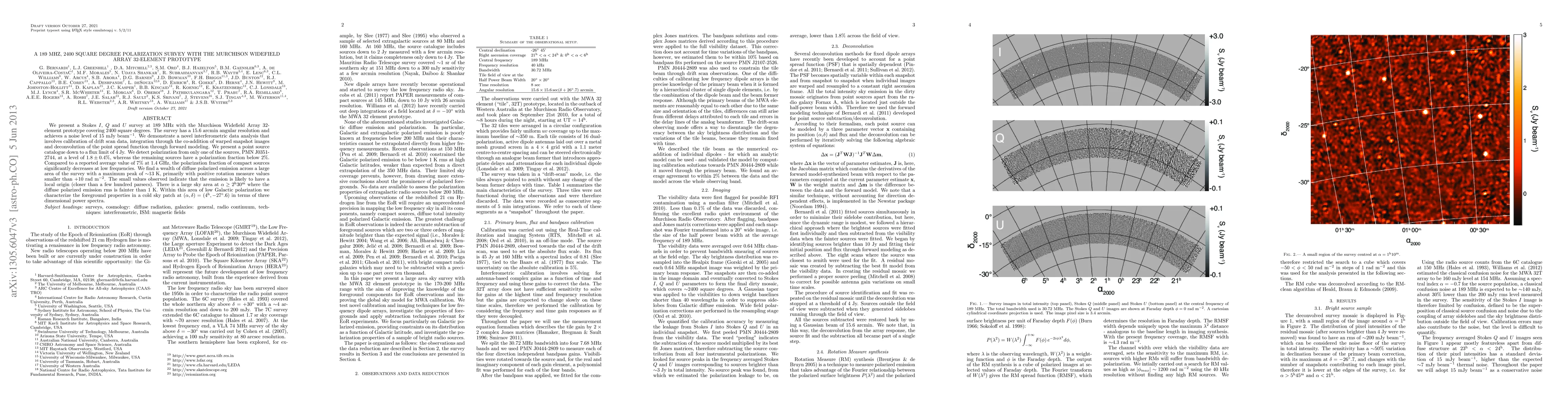 We present a Stokes I, Q and U survey at 189 MHz with the Murchison Widefield Array 32-element prototype covering 2400 square degrees. The survey has a 15.6 arcmin angular resolution and achieves a noise level of 15 mJy/beam. We demonstrate a novel interferometric data analysis that involves calibration of drift scan data, integration through the co-addition of warped snapshot images and deconvolution of the point spread function through forward modeling. We present a point source catalogue down to a flux limit of 4 Jy. We detect polarization from only one of the sources, PMN J0351-2744, at a level of 1.8 \pm 0.4%, whereas the remaining sources have a polarization fraction below 2%. Compared to a reported average value of 7% at 1.4 GHz, the polarization fraction of compact sources significantly decreases at low frequencies. We find a wealth of diffuse polarized emission across a large area of the survey with a maximum peak of ~13 K, primarily with positive rotation measure values smaller than +10 rad/m^2. The small values observed indicate that the emission is likely to have a local origin (closer than a few hundred parsecs). There is a large sky area at 2^h30^m where the diffuse polarized emission rms is fainter than 1 K. Within this area of low Galactic polarization we characterize the foreground properties in a cold sky patch at $(\alpha,\delta) = (4^h,-27^\circ.6)$ in terms of three dimensional power spectra