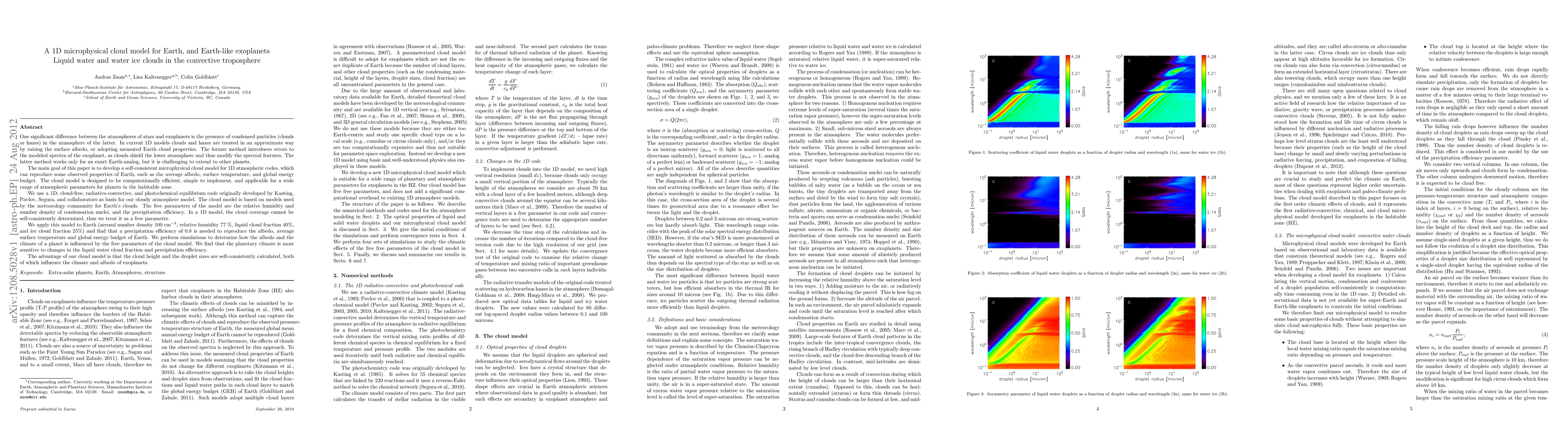 This paper develops a 1D microphysical cloud model for Earth and Earth-like exoplanets, focusing on liquid water and ice clouds in the convective troposphere. The model, based on Earth's meteorology, reproduces observed properties like Earth's albedo and climate, showing sensitivity to cloud fraction and precipitation efficiency.