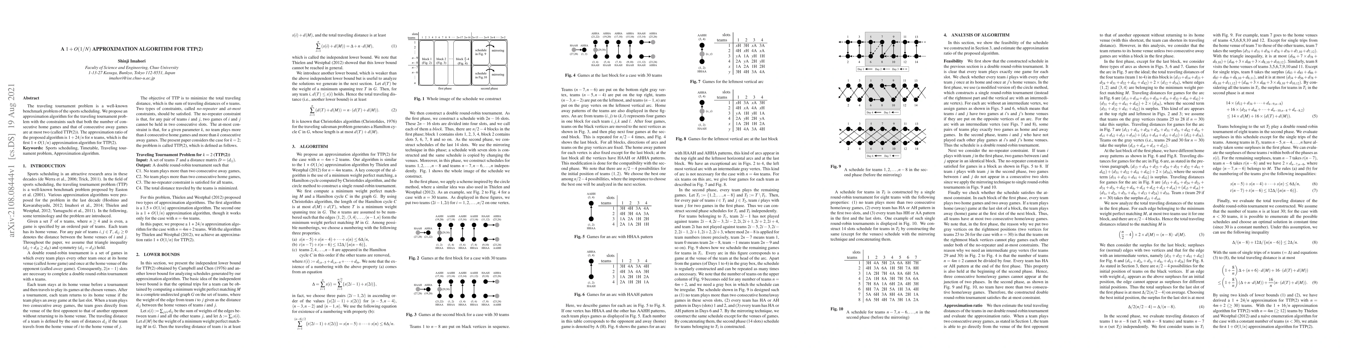 This paper introduces an approximation algorithm for TTP(2), a variant of the traveling tournament problem, achieving a 1 + O(1/n) approximation ratio, which is the first of its kind, improving scheduling efficiency for sports tournaments.
