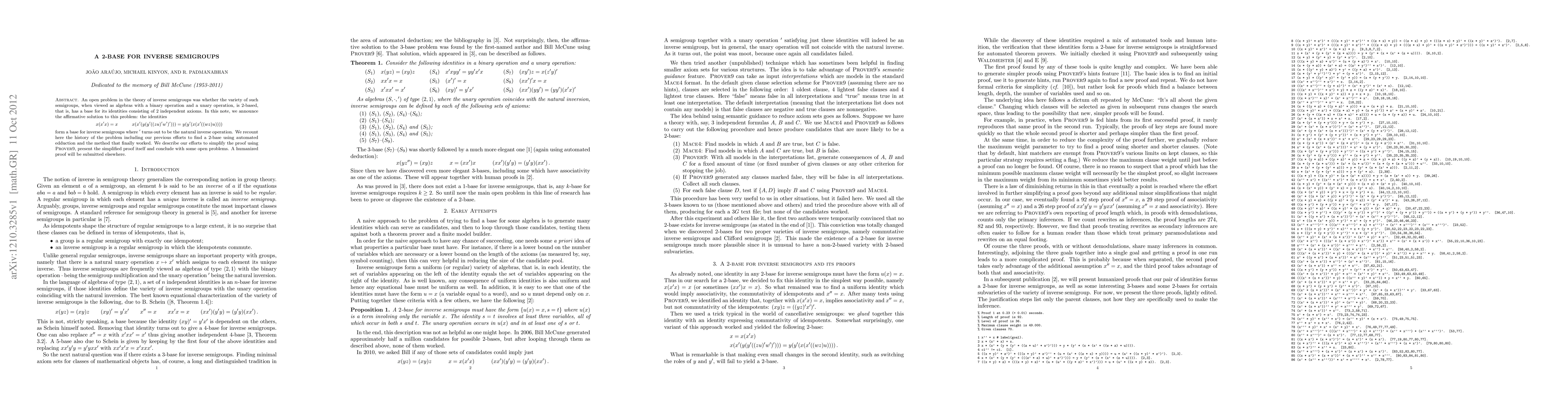 An open problem in the theory of inverse semigroups was whether the variety of such semigroups, when viewed as algebras with a binary operation and a unary operation, is 2-based, that is, has a base for its identities consisting of 2 independent axioms. In this note, we announce the affirmative solution to this problem: the identities \[ \quad x(x'x) = x \qquad \quad x (x' (y (y' ((z u)' w')'))) = y (y' (x (x' ((w z) u)))) \] form a base for inverse semigroups where ${}'$ turns out to be the natural inverse operation. We recount here the history of the problem including our previous efforts to find a 2-base using automated deduction and the method that finally worked. We describe our efforts to simplify the proof using \textsc{Prover9}, present the simplified proof itself and conclude with some open problems.