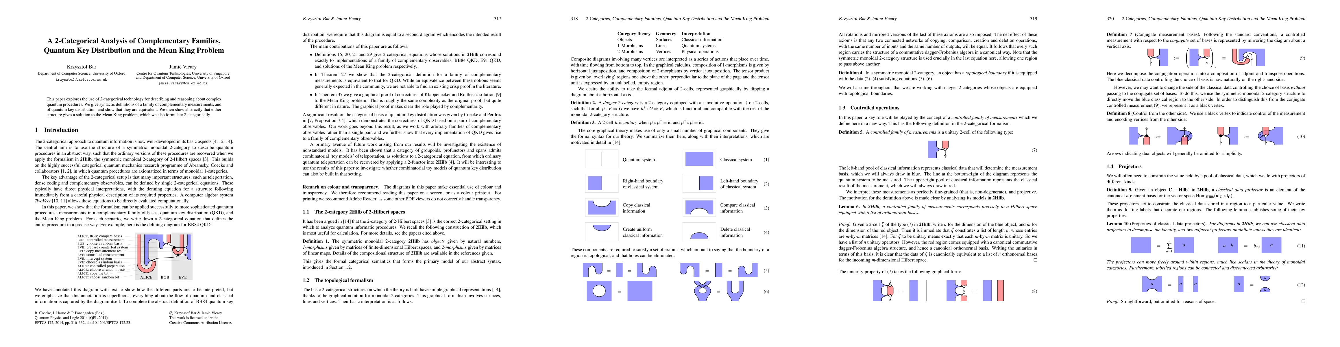 This paper utilizes 2-categorical technology to define and analyze quantum key distribution and complementary measurements, demonstrating their equivalence. It also presents a 2-categorical solution to the Mean King problem.