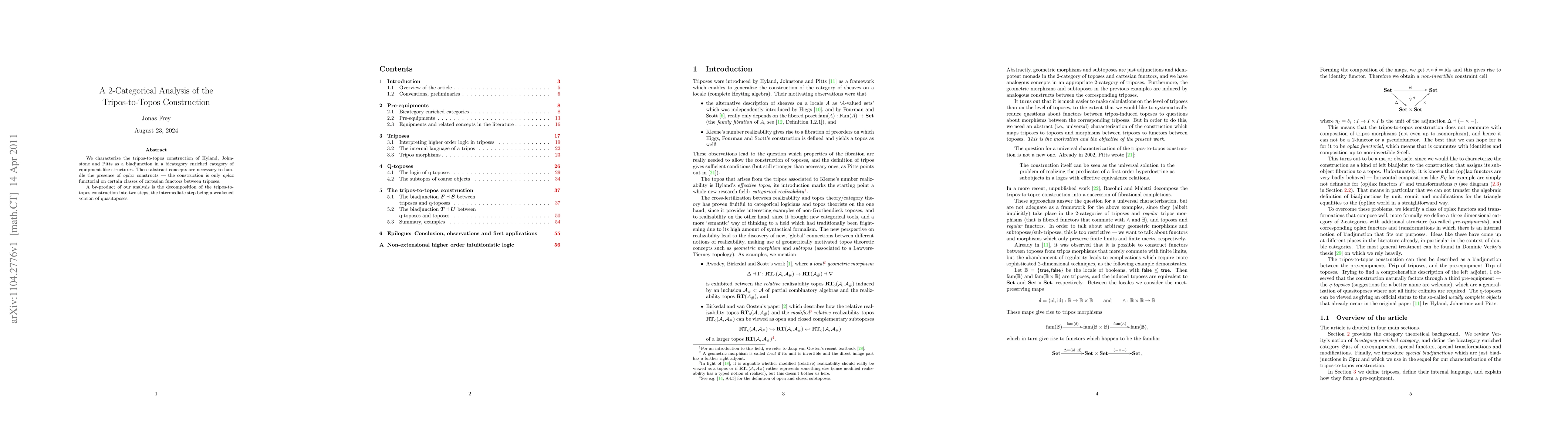 We characterize the tripos-to-topos construction of Hyland, Johnstone and Pitts as a biadjunction in a bicategory enriched category of equipment-like structures. These abstract concepts are necessary to handle the presence of oplax constructs --- the construction is only oplax functorial on certain classes of cartesian functors between triposes. A by-product of our analysis is the decomposition of the tripos-to-topos construction into two steps, the intermediate step being a weakened version of quasitoposes.