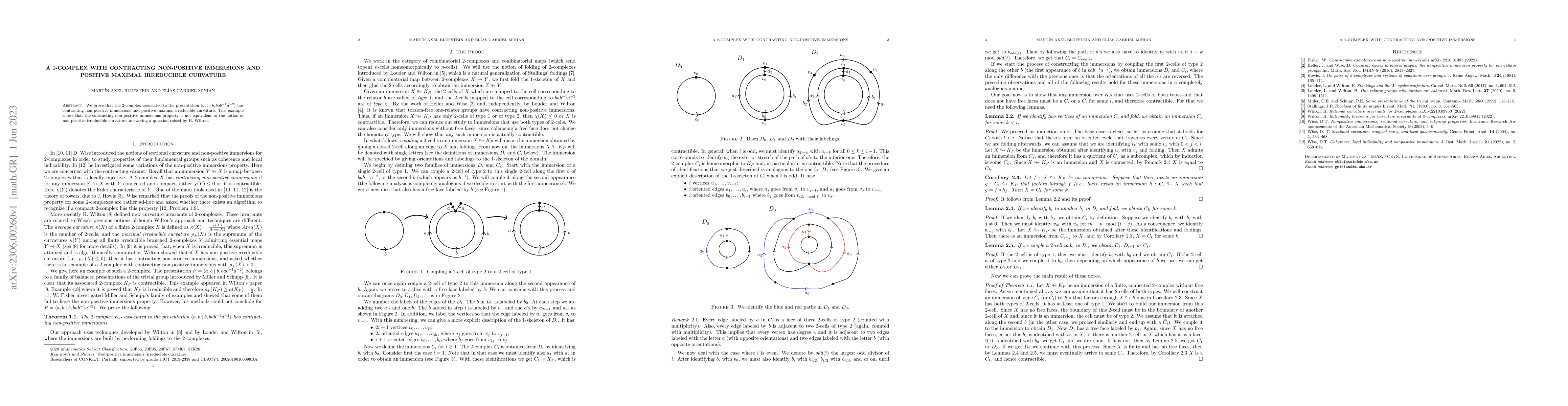 This paper demonstrates that a $2$-complex with a specific presentation exhibits contracting non-positive immersions and positive maximal irreducible curvature, thereby resolving a question regarding the equivalence of these properties.