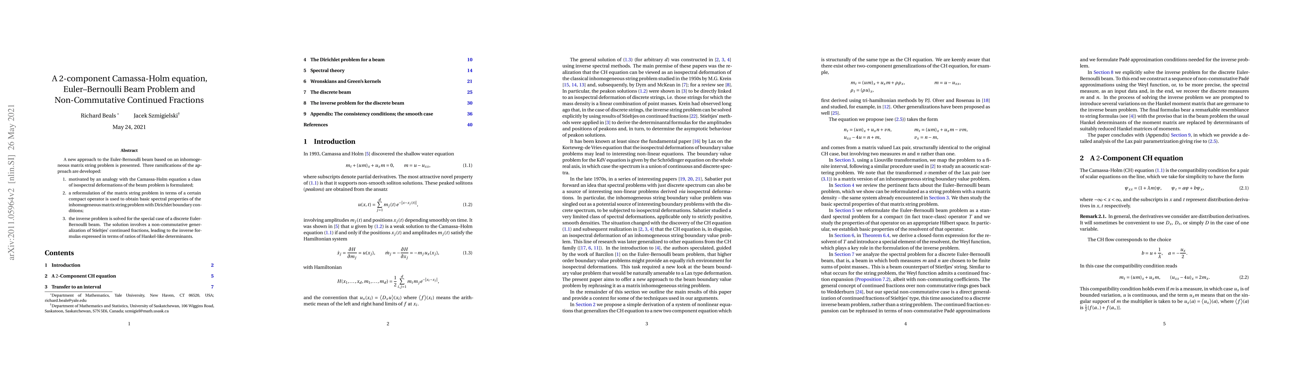 A new approach to the Euler-Bernoulli beam based on an inhomogeneous matrix string problem is presented. Three ramifications of the approach are developed: (1) motivated by an analogy with the Camassa-Holm equation a class of isospectral deformations of the beam problem is formulated; (2) a reformulation of the matrix string problem in terms of a certain compact operator is used to obtain basic spectral properties of the inhomogeneous matrix string problem with Dirichlet boundary conditions; (3) the inverse problem is solved for the special case of a discrete Euler-Bernoulli beam. The solution involves a non-commutative generalization of Stieltjes' continued fractions, leading to the inverse formulas expressed in terms of ratios of Hankel-like determinants.