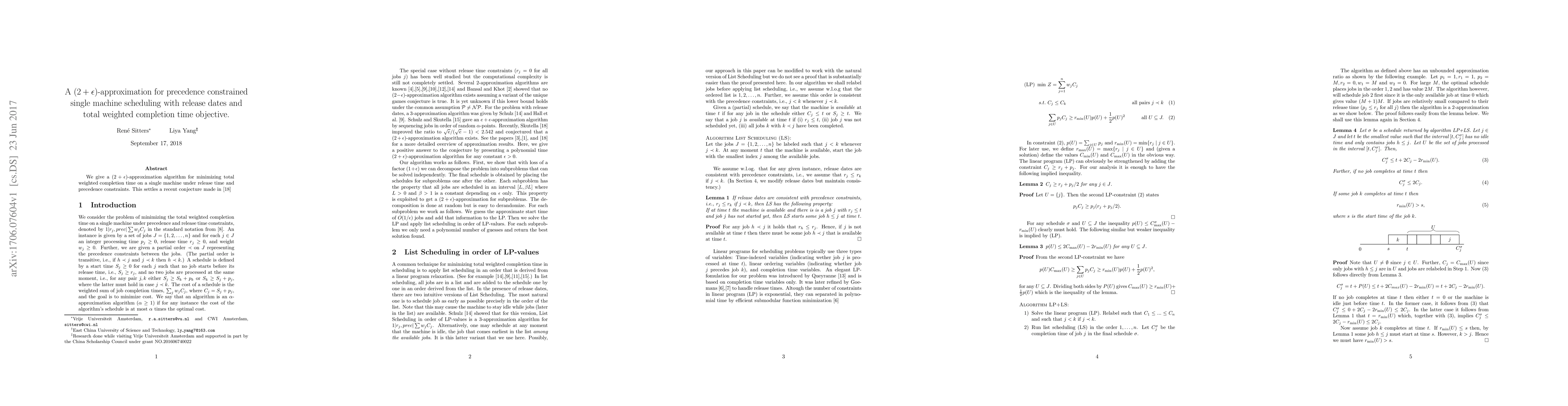 Summary: This paper presents a $(2 + \epsilon)$-approximation algorithm for minimizing total weighted completion time in a single-machine scheduling problem with release dates and precedence constraints, thereby resolving a conjecture from a prior study.