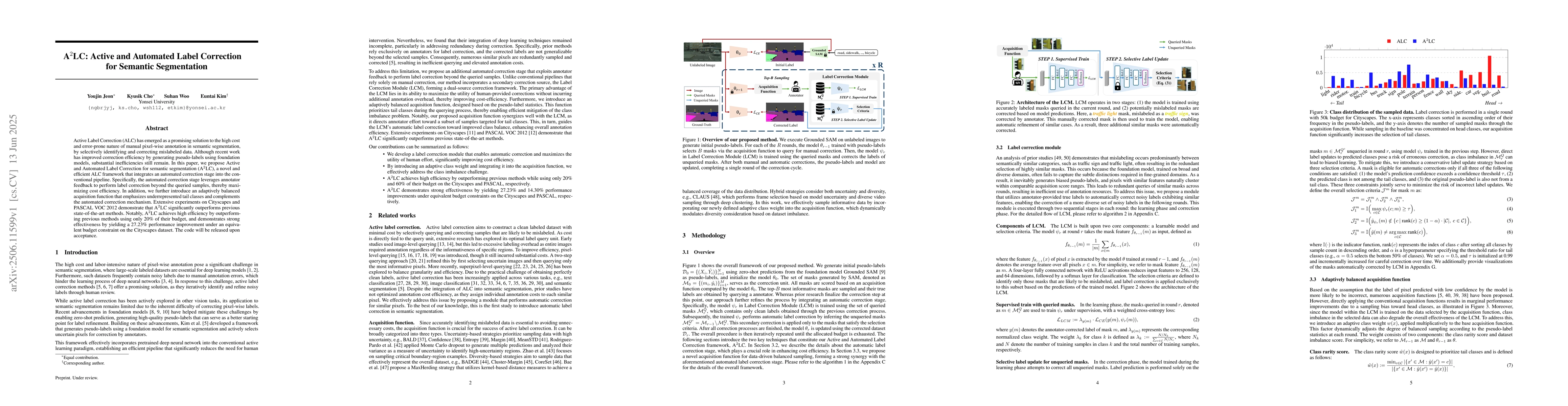 Active Label Correction (ALC) has emerged as a promising solution to the high cost and error-prone nature of manual pixel-wise annotation in semantic segmentation, by selectively identifying and correcting mislabeled data. Although recent work has improved correction efficiency by generating pseudo-labels using foundation models, substantial inefficiencies still remain. In this paper, we propose Active and Automated Label Correction for semantic segmentation (A$^2$LC), a novel and efficient ALC framework that integrates an automated correction stage into the conventional pipeline. Specifically, the automated correction stage leverages annotator feedback to perform label correction beyond the queried samples, thereby maximizing cost efficiency. In addition, we further introduce an adaptively balanced acquisition function that emphasizes underrepresented tail classes and complements the automated correction mechanism. Extensive experiments on Cityscapes and PASCAL VOC 2012 demonstrate that A$^2$LC significantly outperforms previous state-of-the-art methods. Notably, A$^2$LC achieves high efficiency by outperforming previous methods using only 20% of their budget, and demonstrates strong effectiveness by yielding a 27.23% performance improvement under an equivalent budget constraint on the Cityscapes dataset. The code will be released upon acceptance.