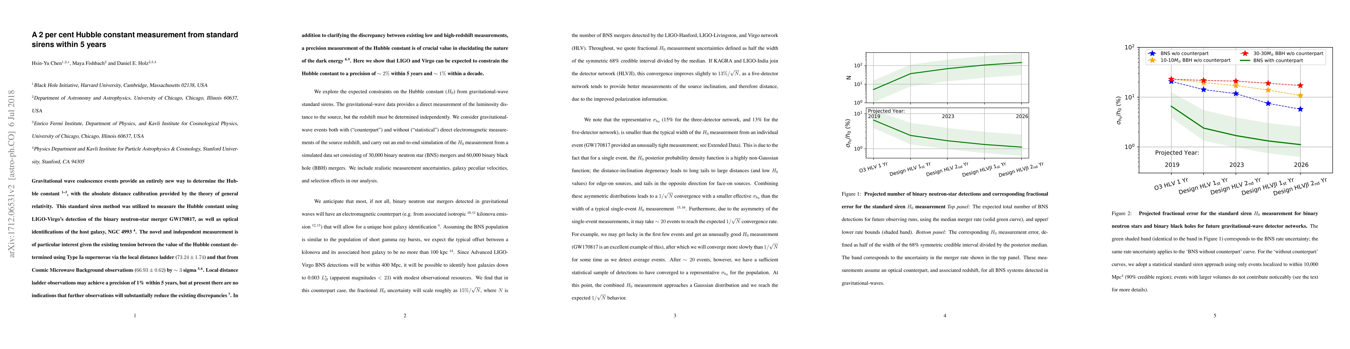 This paper reports a new method for measuring the Hubble constant using gravitational wave detections and optical identifications, achieving a 2% precision within 5 years. This method, termed "standard sirens," aims to resolve discrepancies between low-redshift and high-redshift measurements and to better understand dark energy.