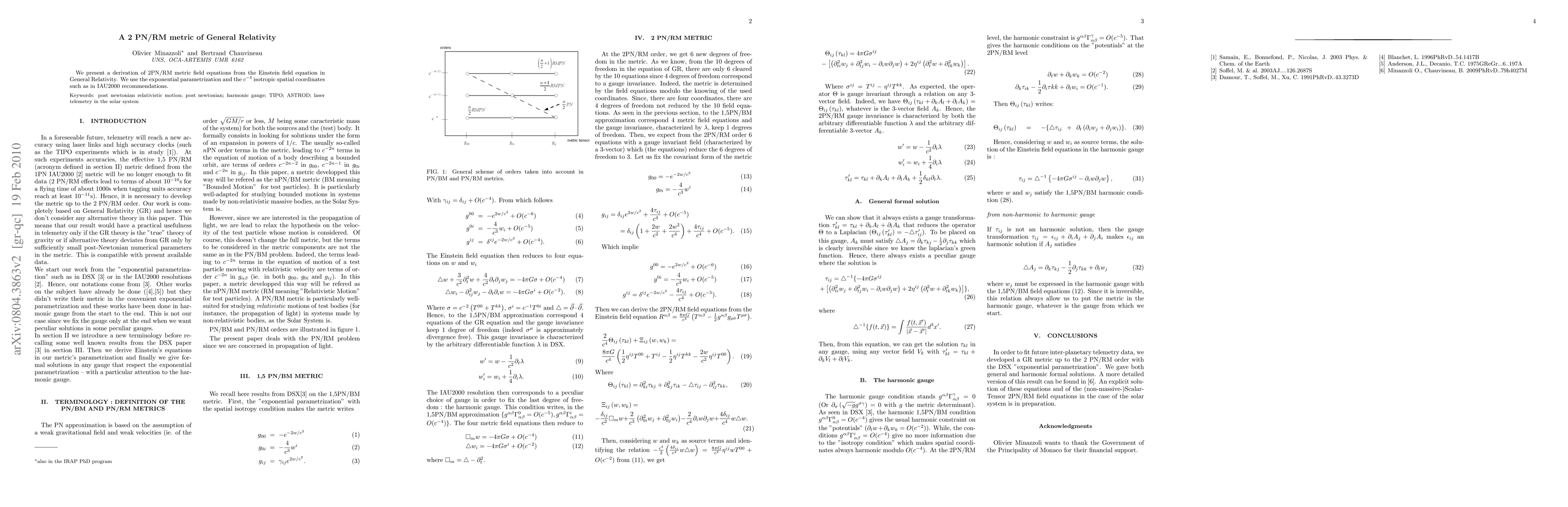 This paper derives the 2PN/RM metric field equations from General Relativity's Einstein field equation using exponential parametrization and $c^{-3}$ isotropic spatial coordinates, aligning with IAU2000 recommendations. The work aims to refine gravitational models for binary systems.