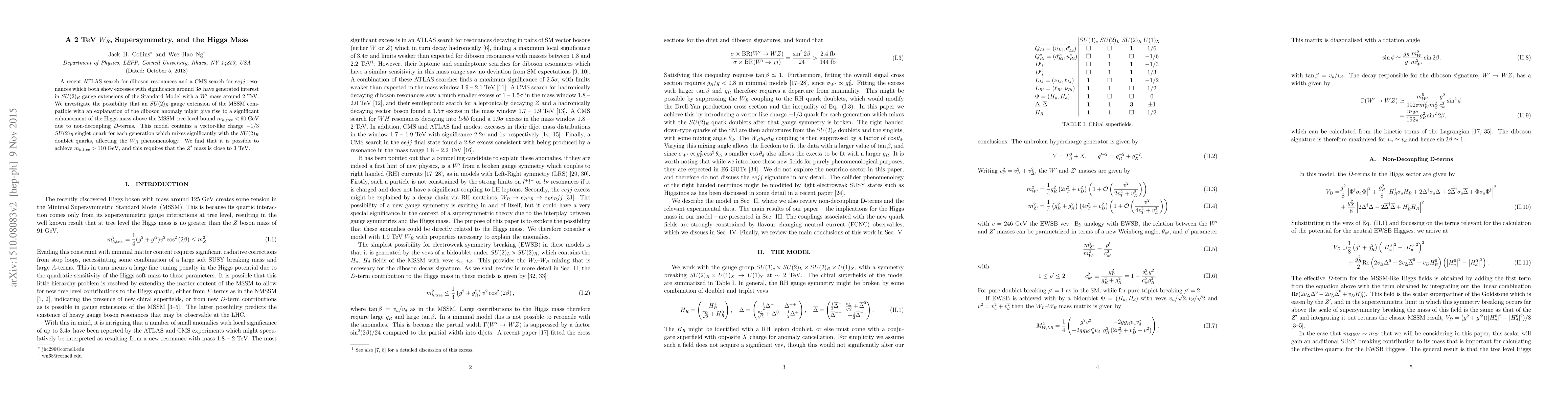 A recent ATLAS search for diboson resonances and a CMS search for $eejj$ resonances which both show excesses with significance around 3 sigma have generated interest in $SU(2)_R$ gauge extensions of the Standard Model with a $W'$ mass around 2 TeV. We investigate the possibility that an $SU(2)_R$ gauge extension of the MSSM compatible with an explanation of the diboson anomaly might give rise to a significant enhancement of the Higgs mass above the MSSM tree level bound $m_{h, \text{tree}} < 90 \; \text{GeV}$ due to non-decoupling D-terms. This model contains a vector-like charge -1/3 $SU(2)_R$ singlet quark for each generation which mixes significantly with the $SU(2)_R$ doublet quarks, affecting the $W_R$ phenomenology. We find that it is possible to achieve $m_{h, \text{tree}} > 110 \; \text {GeV}$, and this requires that the $Z'$ mass is close to 3 TeV.