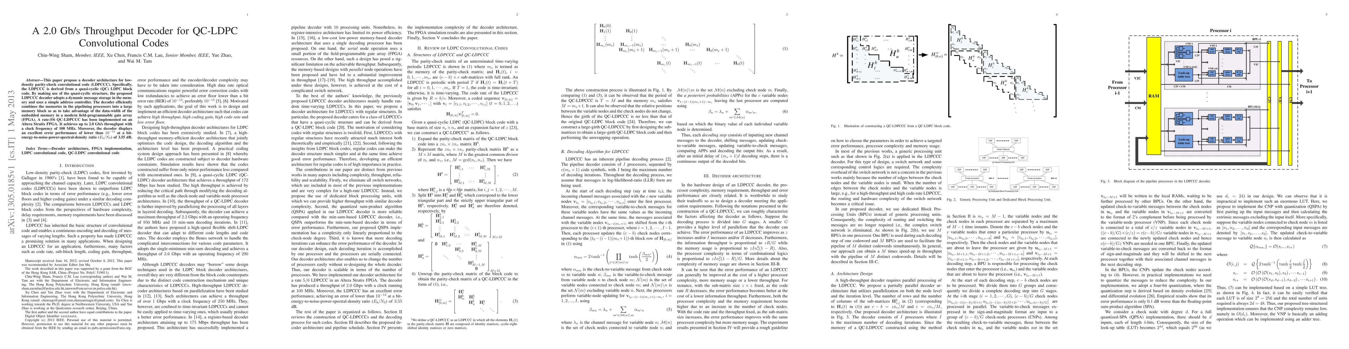 This paper propose a decoder architecture for low-density parity-check convolutional code (LDPCCC). Specifically, the LDPCCC is derived from a quasi-cyclic (QC) LDPC block code. By making use of the quasi-cyclic structure, the proposed LDPCCC decoder adopts a dynamic message storage in the memory and uses a simple address controller. The decoder efficiently combines the memories in the pipelining processors into a large memory block so as to take advantage of the data-width of the embedded memory in a modern field-programmable gate array (FPGA). A rate-5/6 QC-LDPCCC has been implemented on an Altera Stratix FPGA. It achieves up to 2.0 Gb/s throughput with a clock frequency of 100 MHz. Moreover, the decoder displays an excellent error performance of lower than $10^{-13}$ at a bit-energy-to-noise-power-spectral-density ratio ($E_b/N_0$) of 3.55 dB.