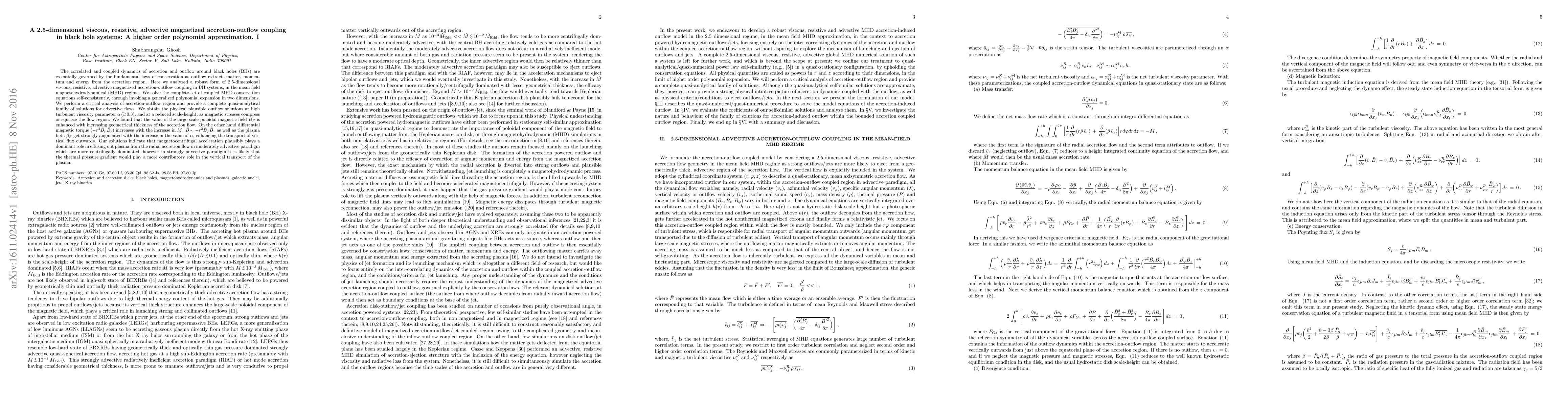 The correlated and coupled dynamics of accretion and outflow around black holes (BHs) are essentially governed by the fundamental laws of conservation as outflow extracts matter, momentum and energy from the accretion region. Here we analyzed a robust form of 2.5-dimensional viscous, resistive, advective magnetized accretion-outflow coupling in BH systems, in the mean field magnetohydrodynamical (MHD) regime. We solve the complete set of coupled MHD conservation equations self-consistently, through invoking a generalized polynomial expansion in two dimensions. We perform a critical analysis of accretion-outflow region and provide a complete quasi-analytical family of solutions for advective flows. We obtain the physical plausible outflow solutions at high turbulent viscosity parameter $\alpha \, (\ge 0.3)$, and at a reduced scale-height, as magnetic stresses compress or squeeze the flow region. We found that the value of the large-scale poloidal magnetic field $\bar B_P$ is enhanced with increasing geometrical thickness of the accretion flow. On the other hand differential magnetic torque ($-r^2 \bar B_{\varphi} \bar B_z$) increases with the increase in $\dot M$. $\bar B_P$, $-r^2 \bar B_{\varphi} \bar B_z$ as well as the plasma beta $\beta_P$ get strongly augmented with the increase in the value of $\alpha$, enhancing the transport of vertical flux outwards. Our solutions indicate that magnetocentrifugal acceleration plausibly plays a dominant role in effusing out plasma from the radial accretion flow in moderately advective paradigm which are more centrifugally dominated, however in strongly advective paradigm it is likely that the thermal pressure gradient would play a more contributory role in the vertical transport of the plasma.