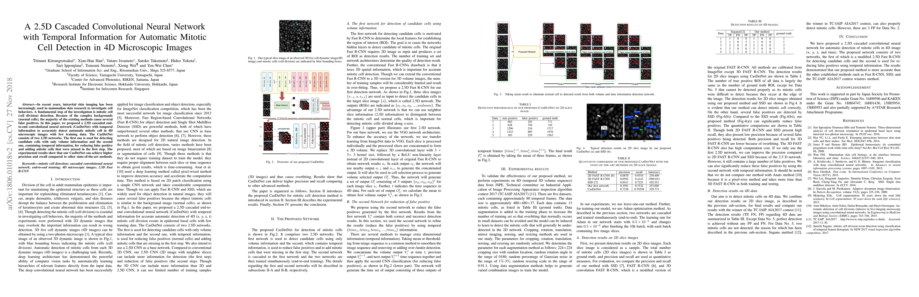 This paper proposes a 2.5D cascaded convolutional neural network (CasDetNet) to accurately detect mitotic cells in 4D microscopic images, reducing false positives and improving precision and recall compared to existing methods. The network uses two 2.5D networks, one for initial candidate detection and another for temporal verification to refine results.