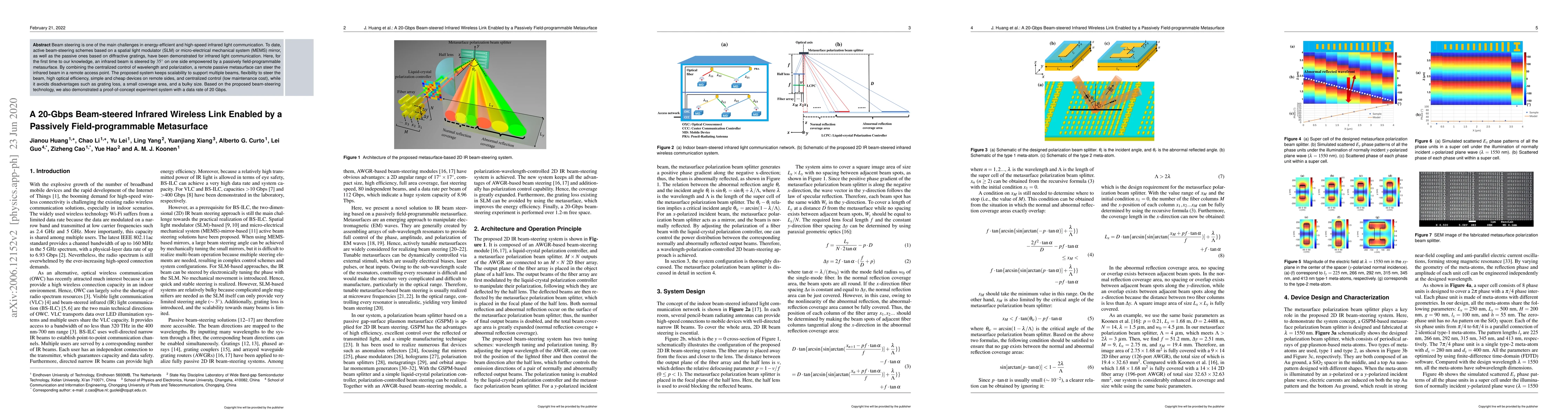 This paper presents a novel 20-Gbps infrared wireless communication link enabled by a passively field-programmable metasurface for beam steering, offering scalability, flexibility, and high optical efficiency while avoiding the drawbacks of traditional beam-steering methods. The proof-of-concept experiment demonstrates the system's effectiveness.