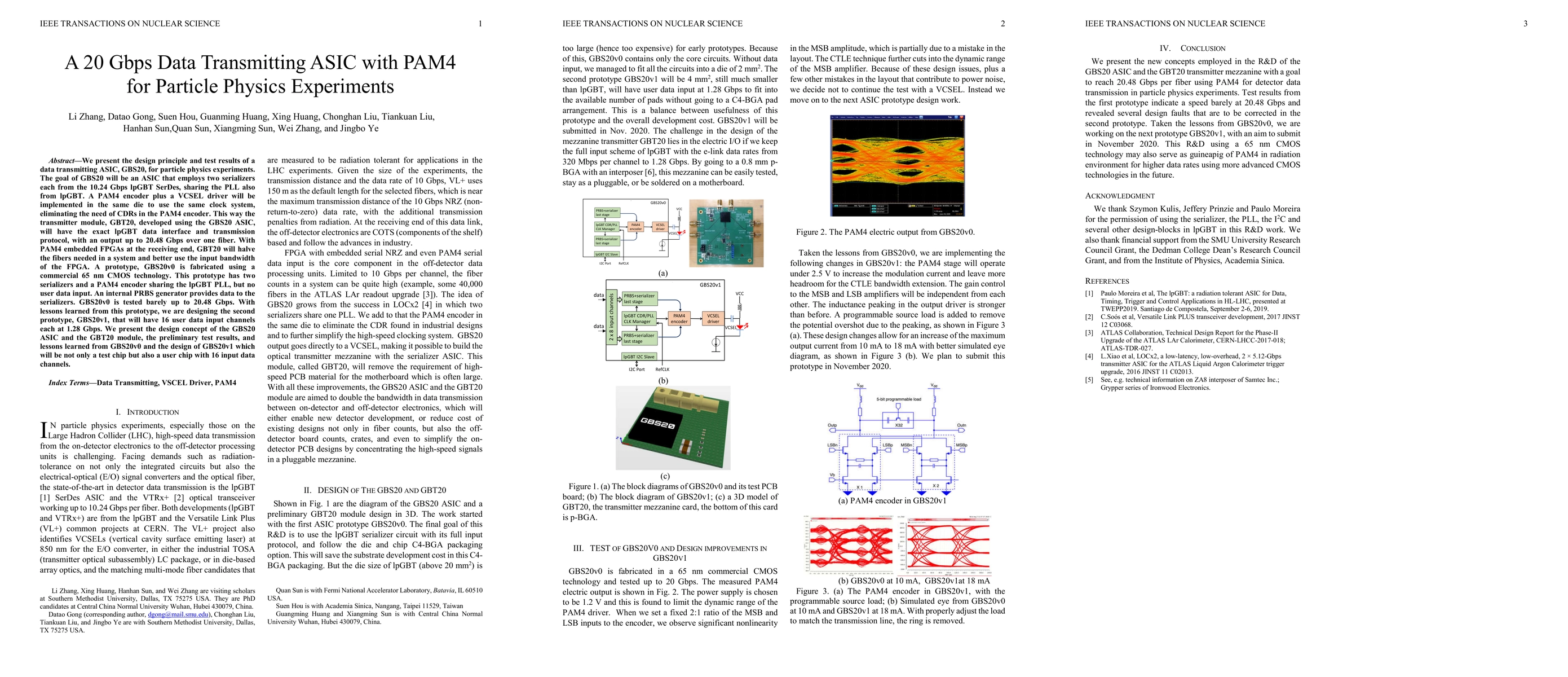 We present the design principle and test results of a data transmitting ASIC, GBS20, for particle physics experiments. The goal of GBS20 will be an ASIC that employs two serializers each from the 10.24 Gbps lpGBT SerDes, sharing the PLL also from lpGBT. A PAM4 encoder plus a VCSEL driver will be implemented in the same die to use the same clock system, eliminating the need of CDRs in the PAM4 encoder. This way the transmitter module, GBT20, developed using the GBS20 ASIC, will have the exact lpGBT data interface and transmission protocol, with an output up to 20.48 Gbps over one fiber. With PAM4 embedded FPGAs at the receiving end, GBT20 will halve the fibers needed in a system and better use the input bandwidth of the FPGA. A prototype, GBS20v0 is fabricated using a commercial 65 nm CMOS technology. This prototype has two serializers and a PAM4 encoder sharing the lpGBT PLL, but no user data input. An internal PRBS generator provides data to the serializers. GBS20v0 is tested barely up to 20.48 Gbps. With lessons learned from this prototype, we are designing the second prototype, GBS20v1, that will have 16 user data input channels each at 1.28 Gbps. We present the design concept of the GBS20 ASIC and the GBT20 module, the preliminary test results, and lessons learned from GBS20v0 and the design of GBS20v1 which will be not only a test chip but also a user chip with 16 input data channels.