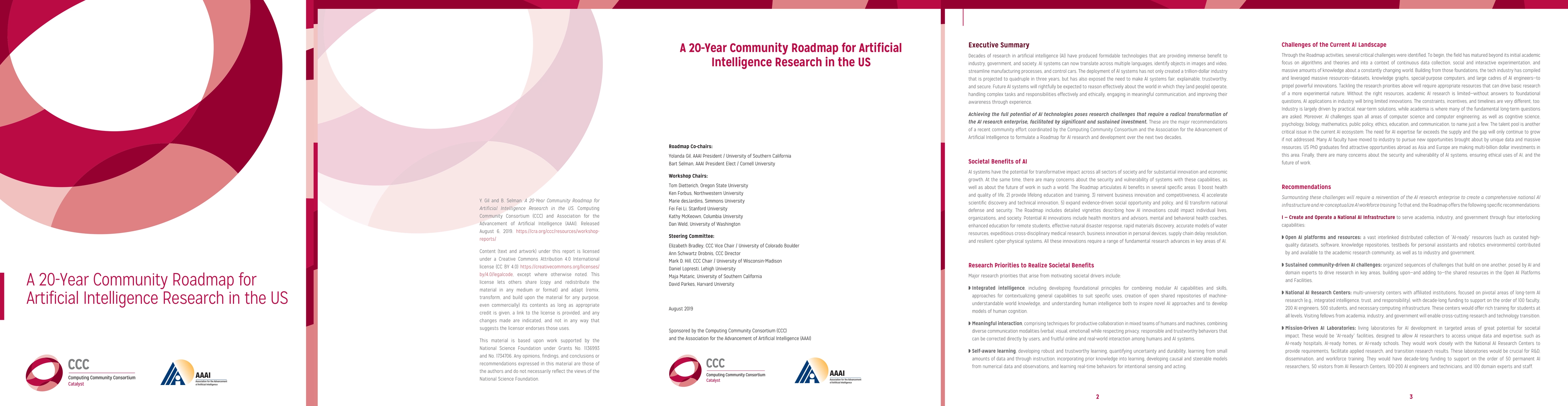 Decades of research in artificial intelligence (AI) have produced formidable technologies that are providing immense benefit to industry, government, and society. AI systems can now translate across multiple languages, identify objects in images and video, streamline manufacturing processes, and control cars. The deployment of AI systems has not only created a trillion-dollar industry that is projected to quadruple in three years, but has also exposed the need to make AI systems fair, explainable, trustworthy, and secure. Future AI systems will rightfully be expected to reason effectively about the world in which they (and people) operate, handling complex tasks and responsibilities effectively and ethically, engaging in meaningful communication, and improving their awareness through experience. Achieving the full potential of AI technologies poses research challenges that require a radical transformation of the AI research enterprise, facilitated by significant and sustained investment. These are the major recommendations of a recent community effort coordinated by the Computing Community Consortium and the Association for the Advancement of Artificial Intelligence to formulate a Roadmap for AI research and development over the next two decades.