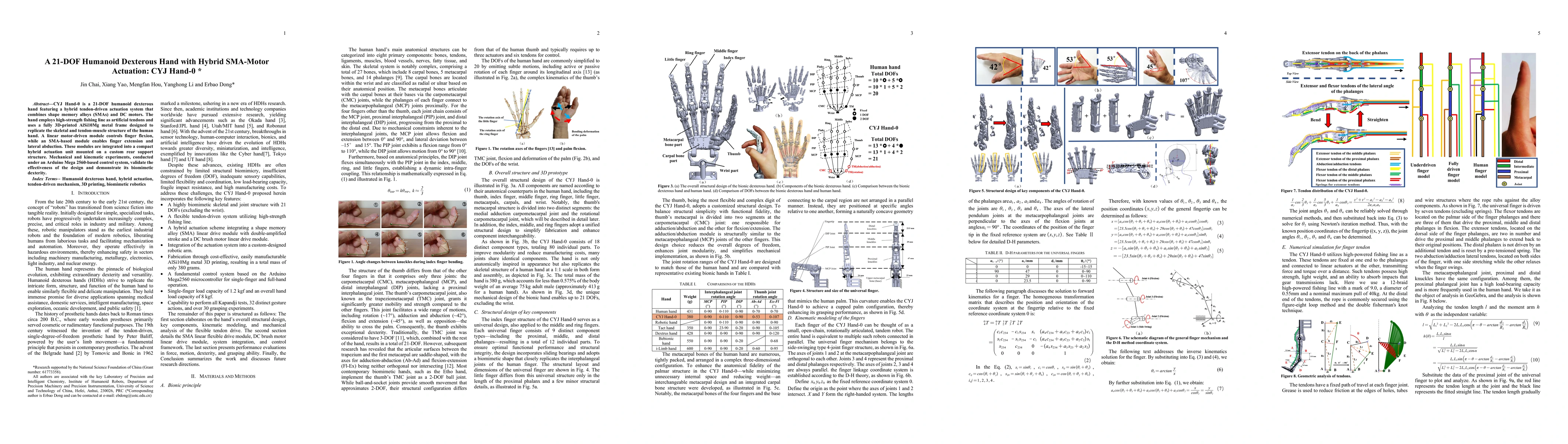 CYJ Hand-0 is a 21-DOF humanoid dexterous hand featuring a hybrid tendon-driven actuation system that combines shape memory alloys (SMAs) and DC motors. The hand employs high-strength fishing line as artificial tendons and uses a fully 3D-printed AlSi10Mg metal frame designed to replicate the skeletal and tendon-muscle structure of the human hand. A linear motor-driven module controls finger flexion, while an SMA-based module enables finger extension and lateral abduction. These modules are integrated into a compact hybrid actuation unit mounted on a custom rear support structure. Mechanical and kinematic experiments, conducted under an Arduino Mega 2560-based control system, validate the effectiveness of the design and demonstrate its biomimetic dexterity.