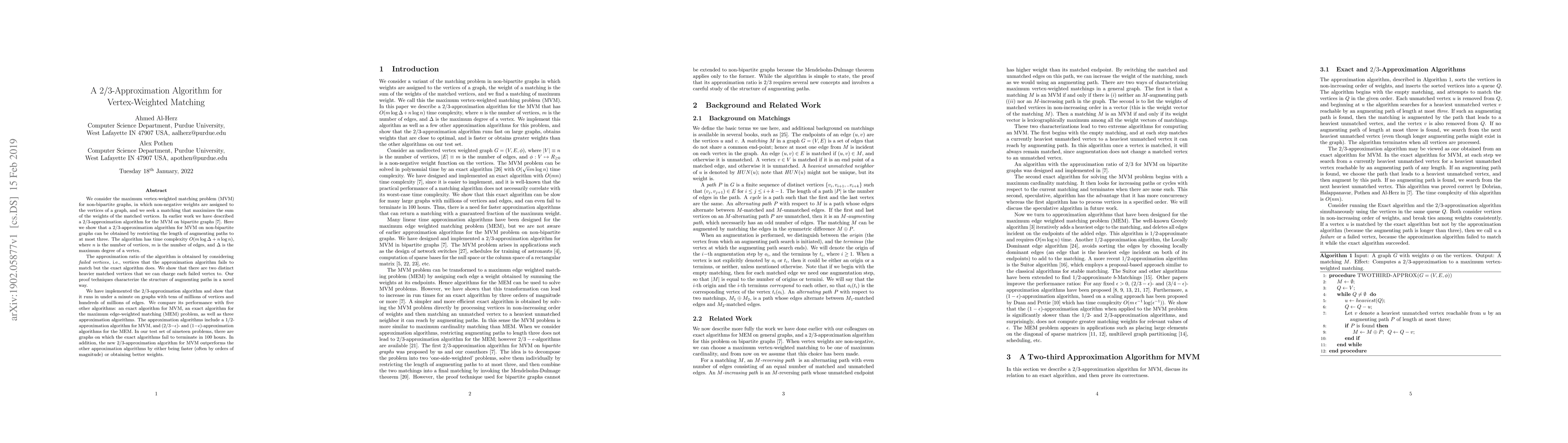 A 2/3-approximation algorithm for non-bipartite graphs' vertex-weighted matching problem has been developed, achieving faster runtimes than exact algorithms on large-scale graphs.