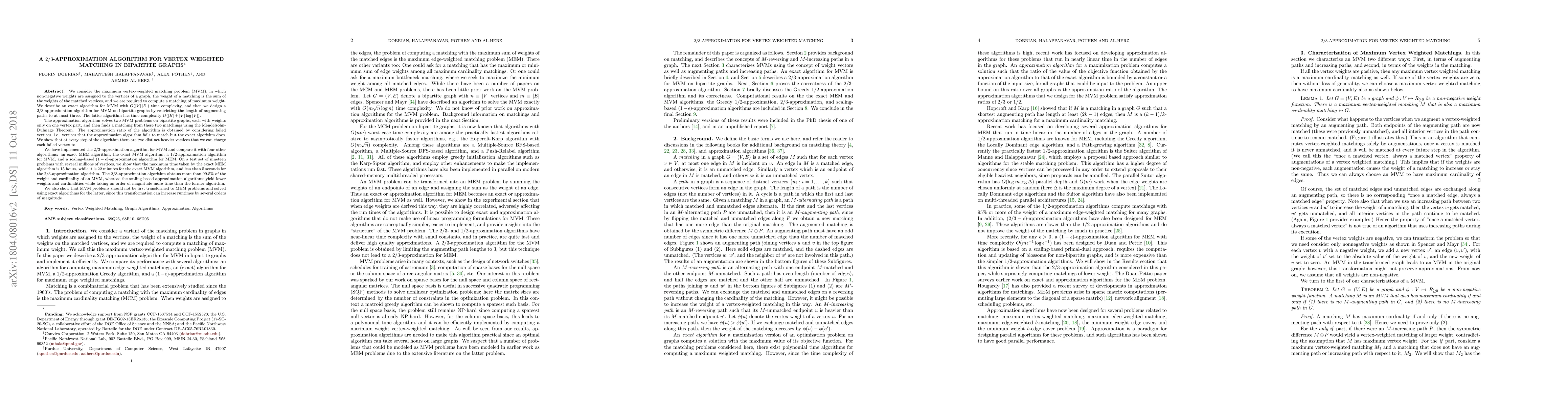 A 2/3-approximation algorithm for finding a matching with maximum weight in bipartite graphs is presented, with improved time complexity compared to exact algorithms and better than other approximation methods.