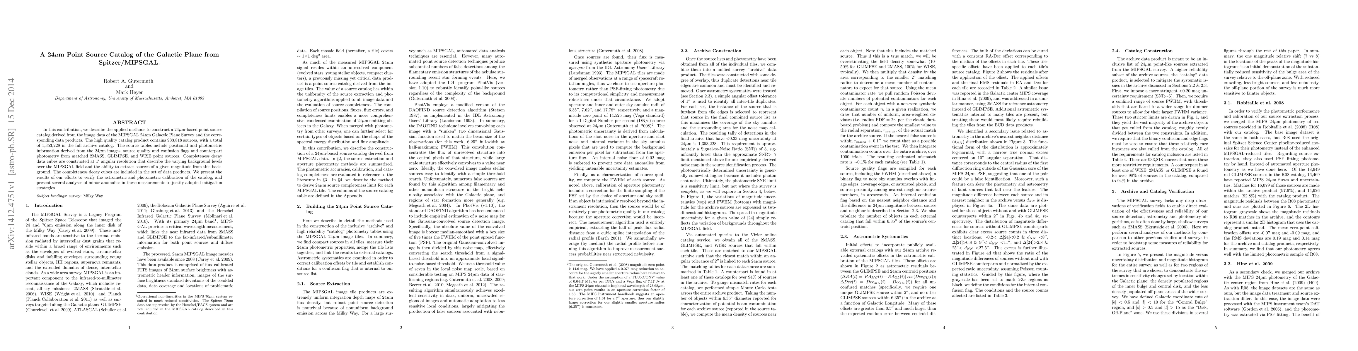In this contribution, we describe the applied methods to construct a 24 micron based point source catalog derived from the image data of the MIPSGAL 24 micron Galactic Plane Survey and the corresponding data products. The high quality catalog product contains 933,818 sources, with a total of 1,353,228 in the full archive catalog. The source tables include positional and photometric informa- tion derived from the 24 micron images, source quality and confusion flags and coun- terpart photometry from matched 2MASS, GLIMPSE, and WISE point sources. Completeness decay data cubes are constructed at 1 arcminute angular resolution that describe the varying background levels over the MIPSGAL field and the ability to extract sources of a given magnitude from this background. The completeness decay cubes are included in the set of data products. We present the results of our efforts to verify the astrometric and photometric calibration of the catalog, and present several analyses of minor anomalies in these measurements to justify adopted mitigation strategies.