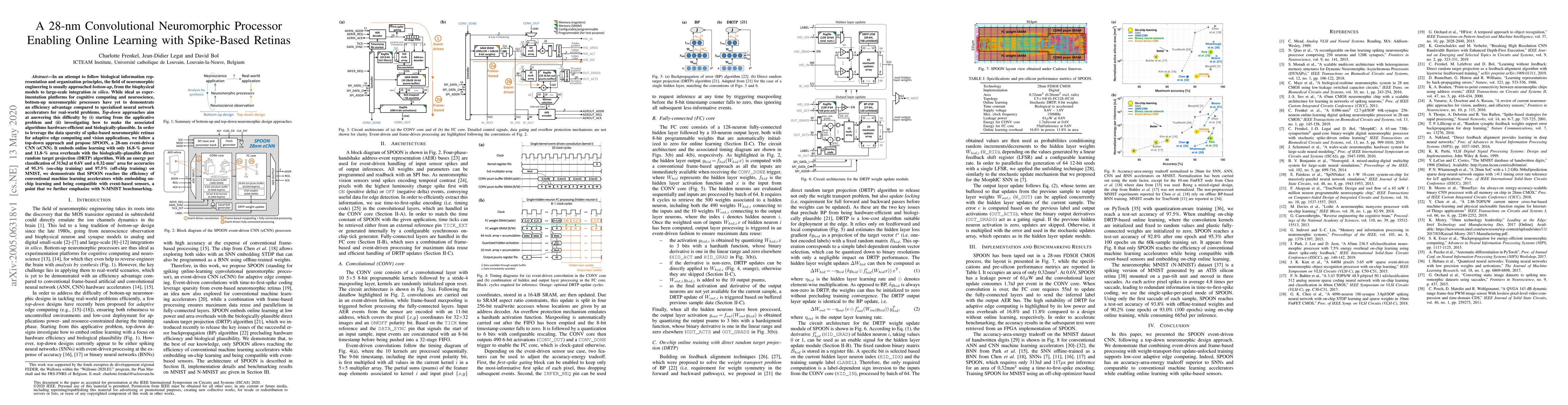 In an attempt to follow biological information representation and organization principles, the field of neuromorphic engineering is usually approached bottom-up, from the biophysical models to large-scale integration in silico. While ideal as experimentation platforms for cognitive computing and neuroscience, bottom-up neuromorphic processors have yet to demonstrate an efficiency advantage compared to specialized neural network accelerators for real-world problems. Top-down approaches aim at answering this difficulty by (i) starting from the applicative problem and (ii) investigating how to make the associated algorithms hardware-efficient and biologically-plausible. In order to leverage the data sparsity of spike-based neuromorphic retinas for adaptive edge computing and vision applications, we follow a top-down approach and propose SPOON, a 28-nm event-driven CNN (eCNN). It embeds online learning with only 16.8-% power and 11.8-% area overheads with the biologically-plausible direct random target projection (DRTP) algorithm. With an energy per classification of 313nJ at 0.6V and a 0.32-mm$^2$ area for accuracies of 95.3% (on-chip training) and 97.5% (off-chip training) on MNIST, we demonstrate that SPOON reaches the efficiency of conventional machine learning accelerators while embedding on-chip learning and being compatible with event-based sensors, a point that we further emphasize with N-MNIST benchmarking.