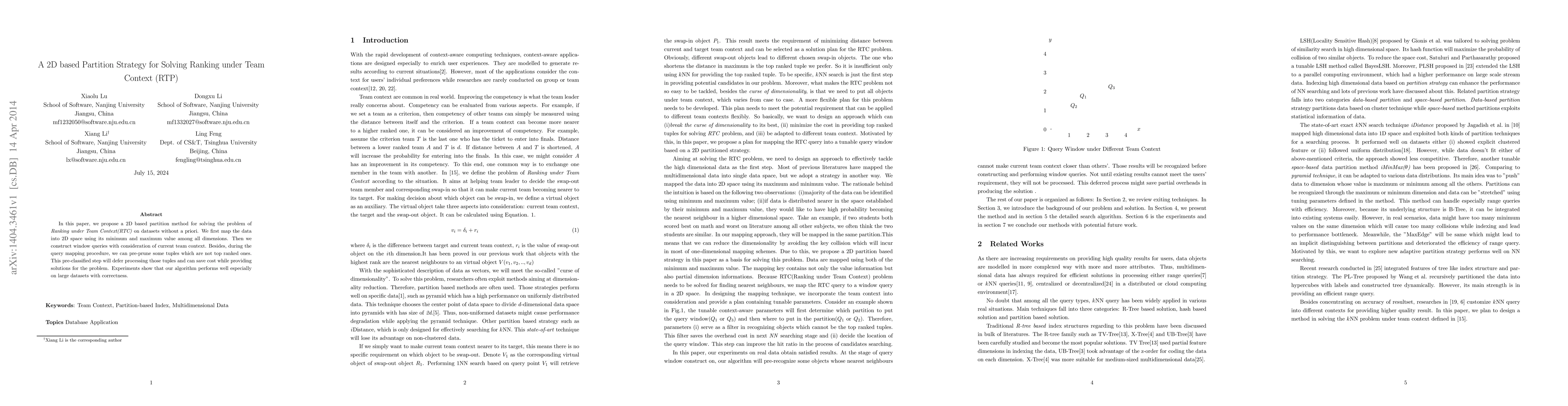 In this paper, we propose a 2D based partition method for solving the problem of Ranking under Team Context(RTC) on datasets without a priori. We first map the data into 2D space using its minimum and maximum value among all dimensions. Then we construct window queries with consideration of current team context. Besides, during the query mapping procedure, we can pre-prune some tuples which are not top ranked ones. This pre-classified step will defer processing those tuples and can save cost while providing solutions for the problem. Experiments show that our algorithm performs well especially on large datasets with correctness.
