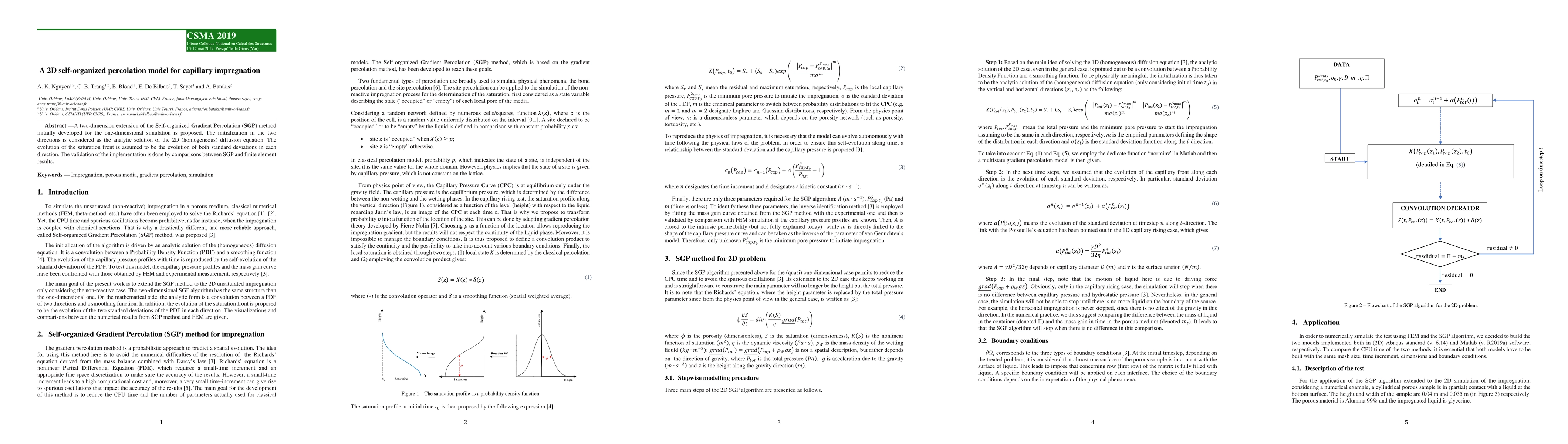 A two-dimension extension of the Self-organized Gradient Percolation (SGP) method initially developed for the one-dimensional simulation is proposed. The initialization in the two directions is considered as the analytic solution of the 2D (homogeneous) diffusion equation. The evolution of the saturation front is assumed to be the evolution of both standard deviations in each direction. The validation of the implementation is done by comparisons between SGP and finite element results.