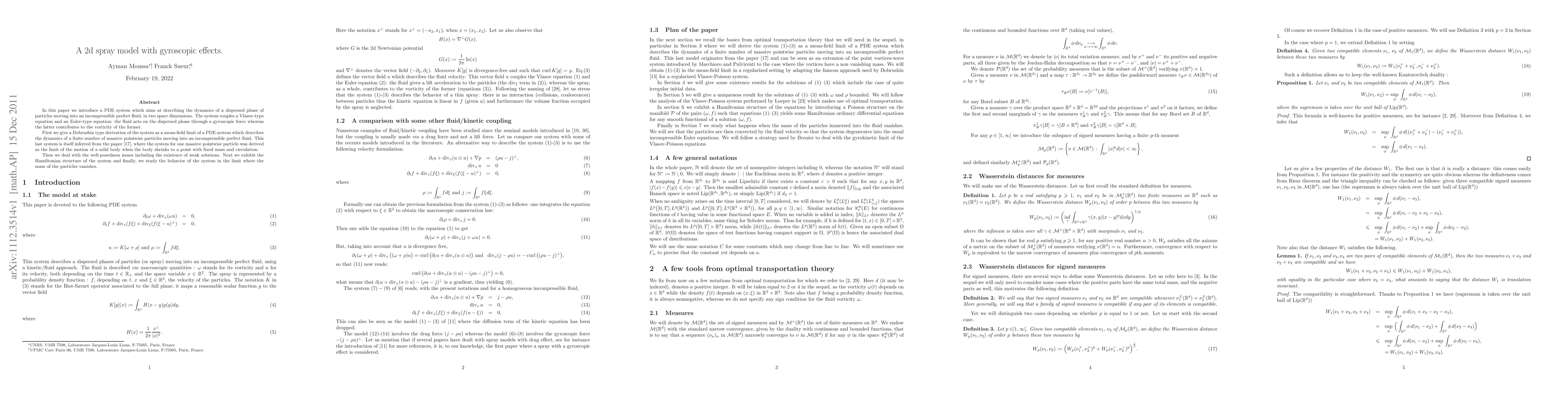 In this paper we introduce a PDE system which aims at describing the dynamics of a dispersed phase of particles moving into an incompressible perfect fluid, in two space dimensions. The system couples a Vlasov-type equation and an Euler-type equation: the fluid acts on the dispersed phase through a gyroscopic force whereas the latter contributes to the vorticity of the former. First we give a Dobrushin type derivation of the system as a mean-field limit of a PDE system which describes the dynamics of a finite number of massive pointwise particles moving into an incompressible perfect fluid. This last system is itself inferred from a joint work of the second author with O. Glass and C. Lacave, where the system for one massive pointwise particle was derived as the limit of the motion of a solid body when the body shrinks to a point with fixed mass and circulation. Then we deal with the well-posedness issues including the existence of weak solutions. Next we exhibit the Hamiltonian structure of the system and finally, we study the behavior of the system in the limit where the mass of the particles vanishes.