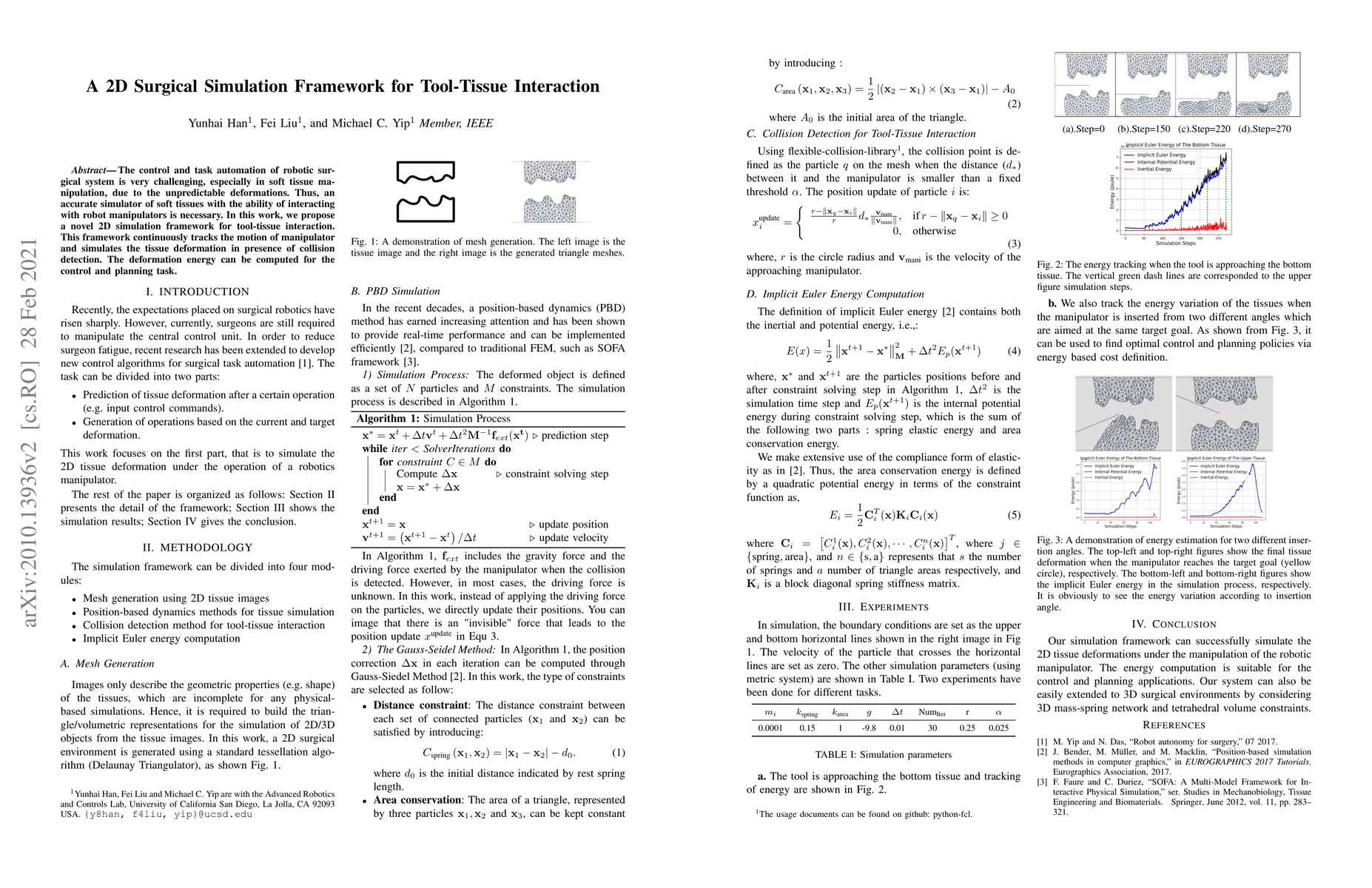 The control and task automation of robotic surgical system is very challenging, especially in soft tissue manipulation, due to the unpredictable deformations. Thus, an accurate simulator of soft tissues with the ability of interacting with robot manipulators is necessary. In this work, we propose a novel 2D simulation framework for tool-tissue interaction. This framework continuously tracks the motion of manipulator and simulates the tissue deformation in presence of collision detection. The deformation energy can be computed for the control and planning task.