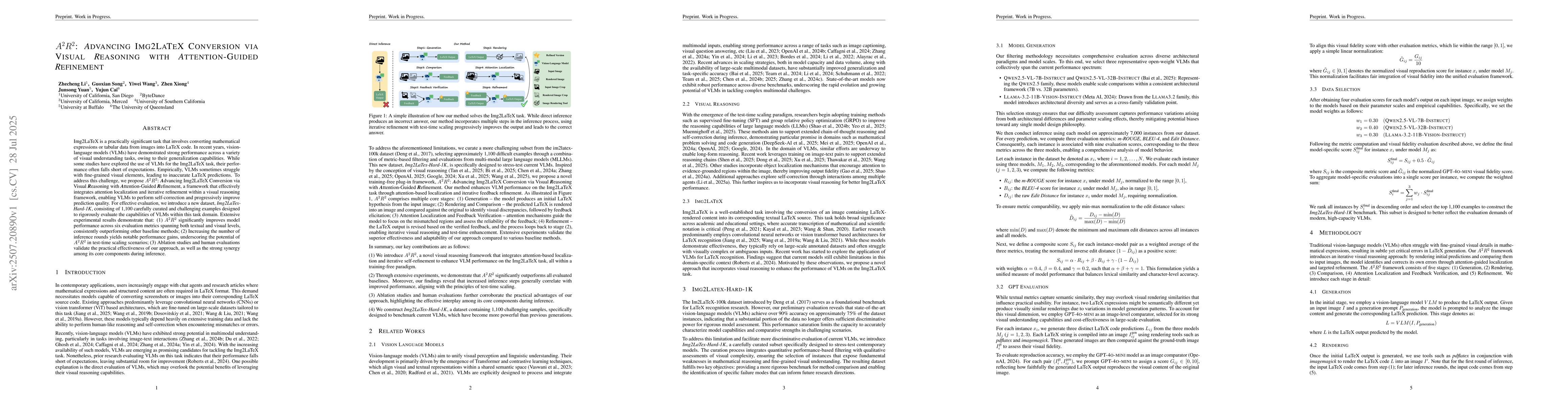 Img2LaTeX is a practically significant task that involves converting mathematical expressions or tabular data from images into LaTeX code. In recent years, vision-language models (VLMs) have demonstrated strong performance across a variety of visual understanding tasks, owing to their generalization capabilities. While some studies have explored the use of VLMs for the Img2LaTeX task, their performance often falls short of expectations. Empirically, VLMs sometimes struggle with fine-grained visual elements, leading to inaccurate LaTeX predictions. To address this challenge, we propose $A^2R^2$: Advancing Img2LaTeX Conversion via Visual Reasoning with Attention-Guided Refinement, a framework that effectively integrates attention localization and iterative refinement within a visual reasoning framework, enabling VLMs to perform self-correction and progressively improve prediction quality. For effective evaluation, we introduce a new dataset, Img2LaTex-Hard-1K, consisting of 1,100 carefully curated and challenging examples designed to rigorously evaluate the capabilities of VLMs within this task domain. Extensive experimental results demonstrate that: (1) $A^2R^2$ significantly improves model performance across six evaluation metrics spanning both textual and visual levels, consistently outperforming other baseline methods; (2) Increasing the number of inference rounds yields notable performance gains, underscoring the potential of $A^2R^2$ in test-time scaling scenarios; (3) Ablation studies and human evaluations validate the practical effectiveness of our approach, as well as the strong synergy among its core components during inference.