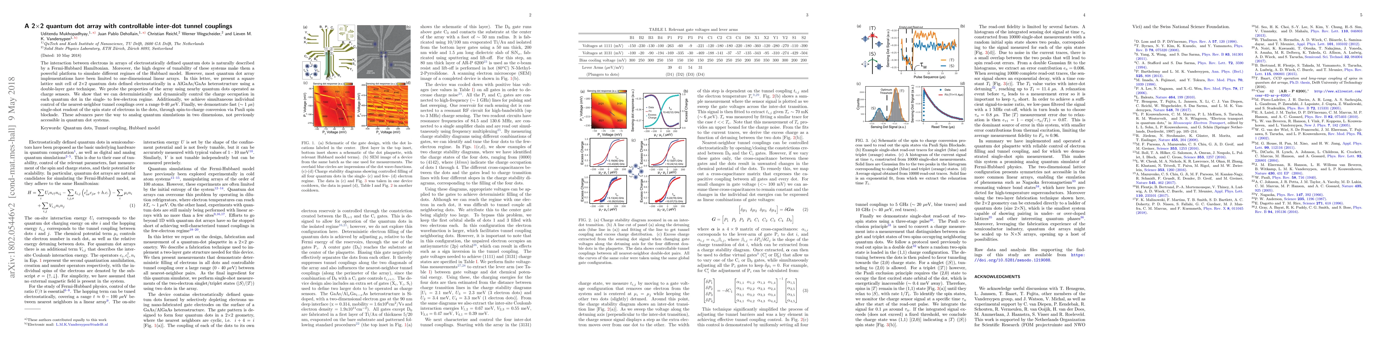 This paper describes a 2x2 quantum dot array in a AlGaAs/GaAs heterostructure, where individual electron occupation and inter-dot tunnel couplings are dynamically controlled. It also presents fast single-shot readout of spin states, facilitating two-dimensional analog quantum simulations.