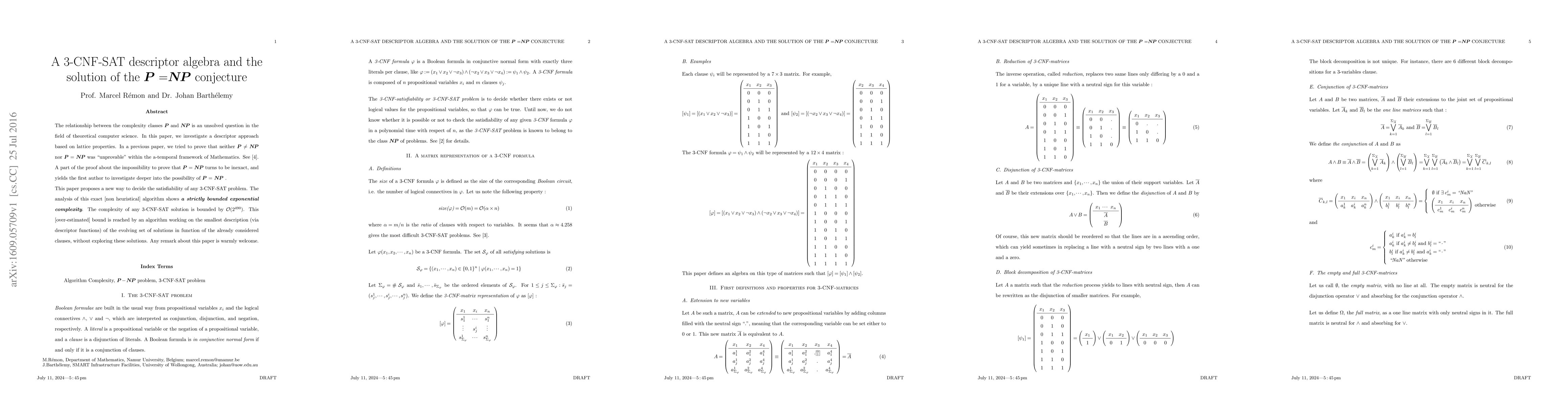 This paper proposes a novel descriptor algebra for solving 3-CNF-SAT problems, suggesting a strictly bounded exponential complexity of O(2^490). The approach leverages lattice properties and descriptor functions to determine satisfiability without exploring solutions.