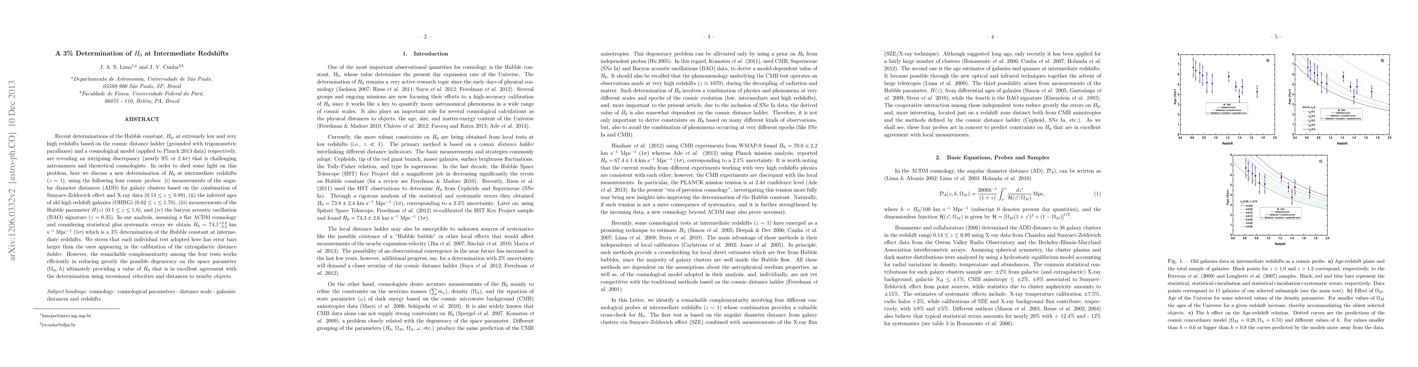 Recent determinations of the Hubble constant, H_0, at extremely low and very high redshifts based on the cosmic distance ladder (grounded with trigonometric parallaxes) and a cosmological model (applied to Planck 2013 data) respectively, are revealing an intriguing discrepancy (nearly 9% or 2.4sigma) that is challenging astronomers and theoretical cosmologists. In order to shed some light on this problem, here we discuss a new determination of H_0 at intermediate redshifts (z ~ 1), using the following four cosmic probes: (i) measurements of the angular diameter distances (ADD) for galaxy clusters based on the combination of Sunyaev-Zeldovich effect and X-ray data (0.14 < z < 0.89$), (ii) the inferred ages of old high redshift galaxies (OHRG) (0.62 < z < 1.70), (iii) measurements of the Hubble parameter H(z) (0.1 < z < 1.8), and (iv) the baryon acoustic oscillation (BAO) signature (z=0.35). In our analysis, assuming a flat LCDM cosmology and considering statistical plus systematic errors we obtain H_0 = 74.1^{+2.2}_{-2.2} km/s.Mpc (1sigma) which is a 3% determination of the Hubble constant at intermediate redshifts. We stress that each individual test adopted here has error bars larger than the ones appearing in the calibration of the extragalactic distance ladder. However, the remarkable complementarity among the four tests works efficiently in reducing greatly the possible degeneracy on the space parameter (Omega_m,h) ultimately providing a value of H_0 that is in excellent agreement with the determination using recessional velocities and distances to nearby objects.