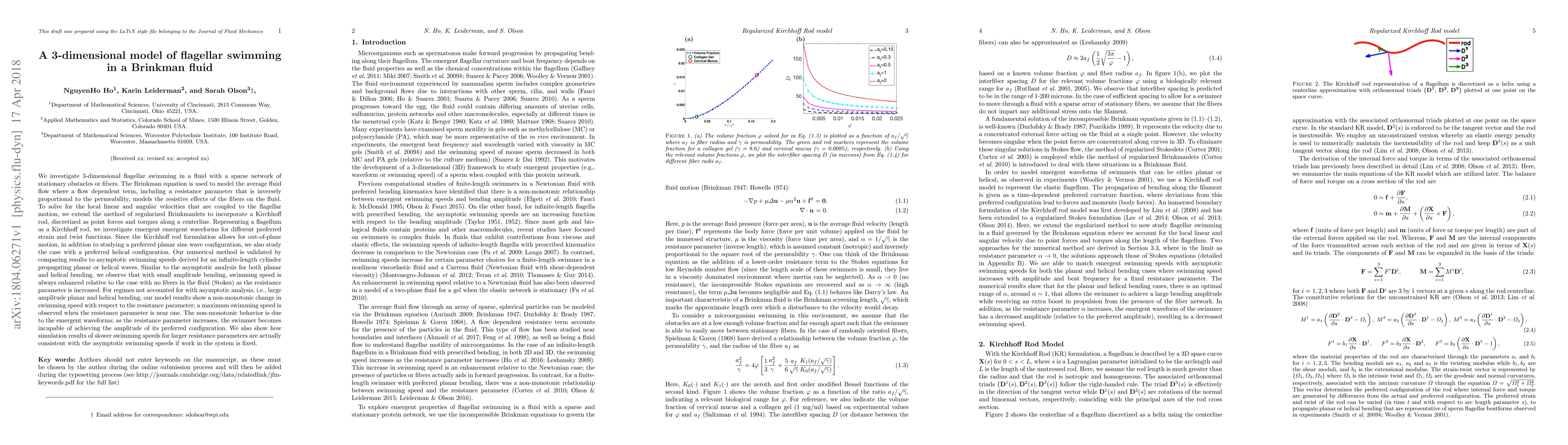 Researchers modeled 3D flagellar swimming in a fluid with obstacles, finding that small amplitude bending enhances swimming speed compared to no fibers, regardless of wave shape.